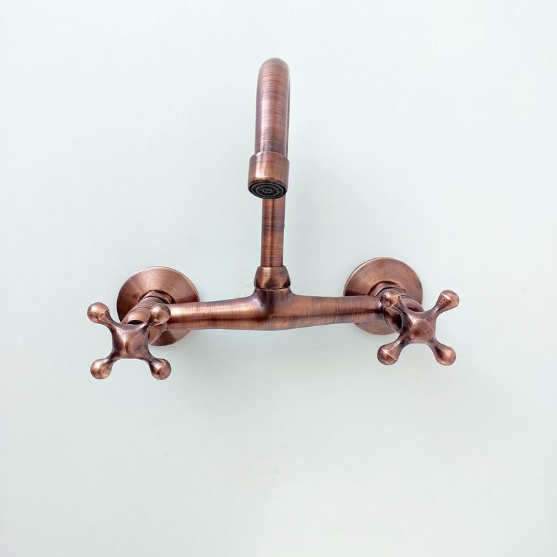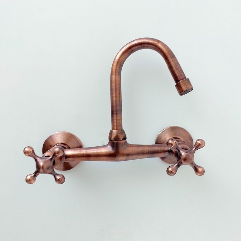 8" Copper Wall Mount Faucet, Gooseneck Faucet, Vintage Copper Wall Mounted tap, 2 Hole Wall Mount Bathroom Faucet with Cross Handles