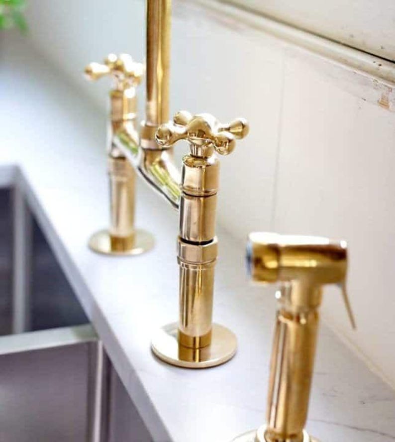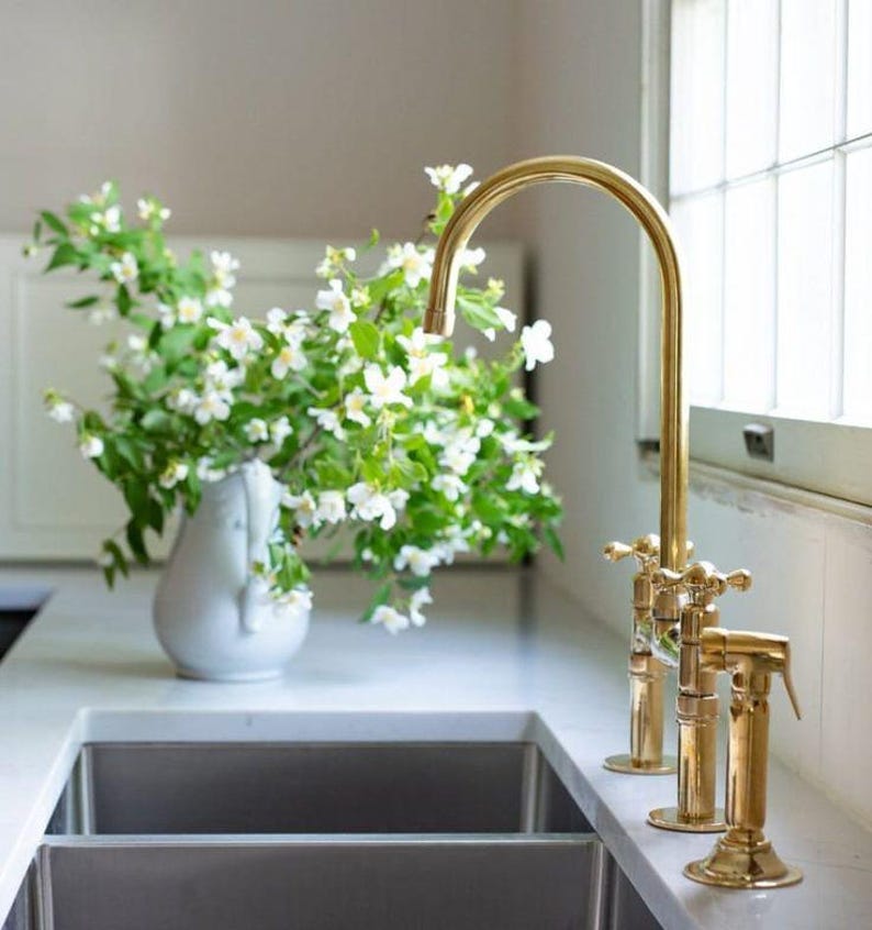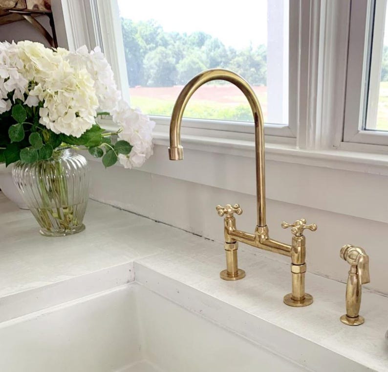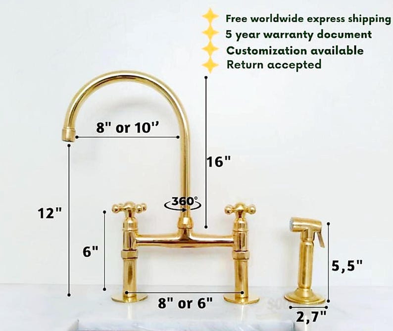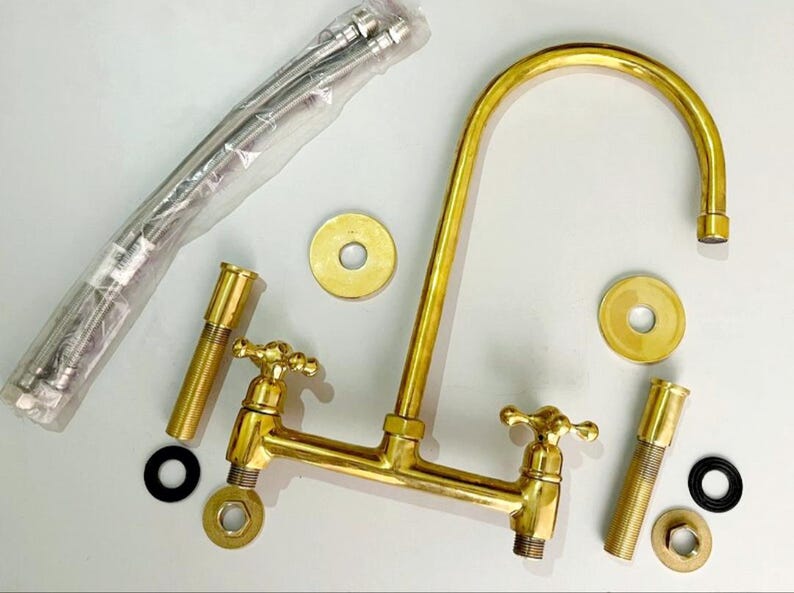 Unlacquered Brass Kitchen Bridge Faucet, a sophisticated and versatile sink fixture that effortlessly combines timeless aesthetics with high-quality craftsmanship. This solid brass faucet is meticulously designed to elevate the style and functionality of any kitchen space. Its sleek and elegant bridge design adds a touch of classic charm, making it a perfect choice for both traditional and contemporary decor styles. With its stunning unlacquered brass finish, this faucet not only brings a warm and inviting glow to your kitchen but also develops a rich patina over time, giving it a unique and aged appearance.
