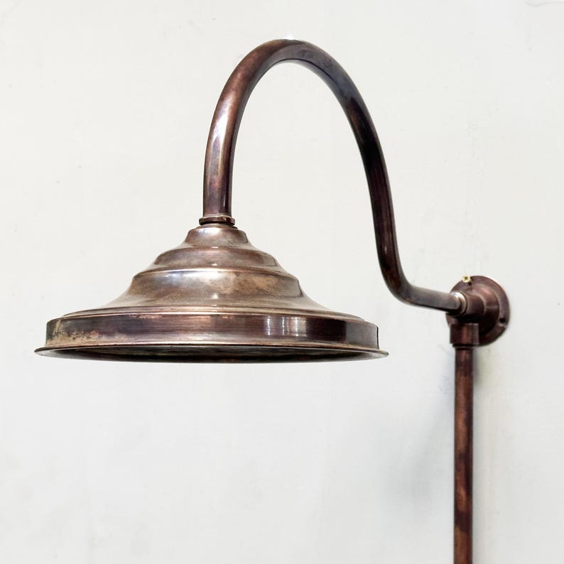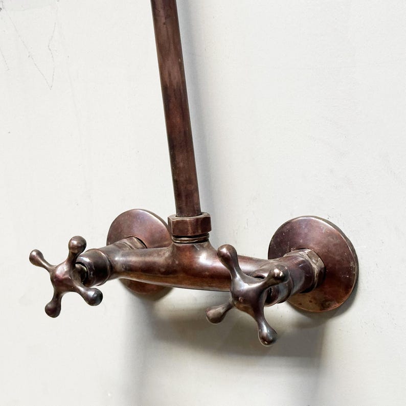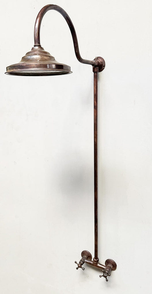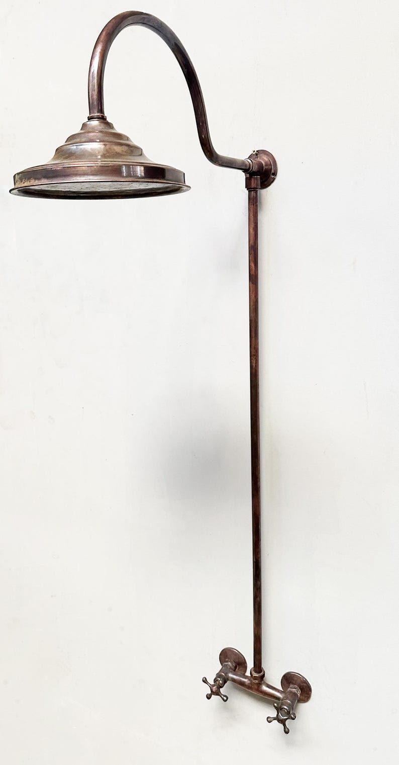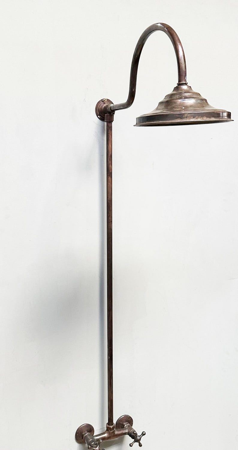 This exposed shower system who can be used as an indoor or outdoor shower system is made of copper with an antique finish.