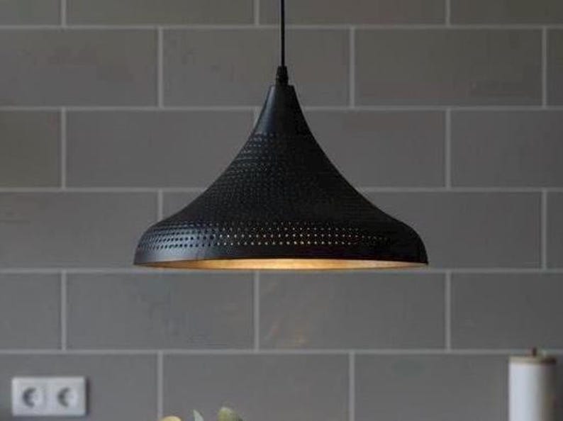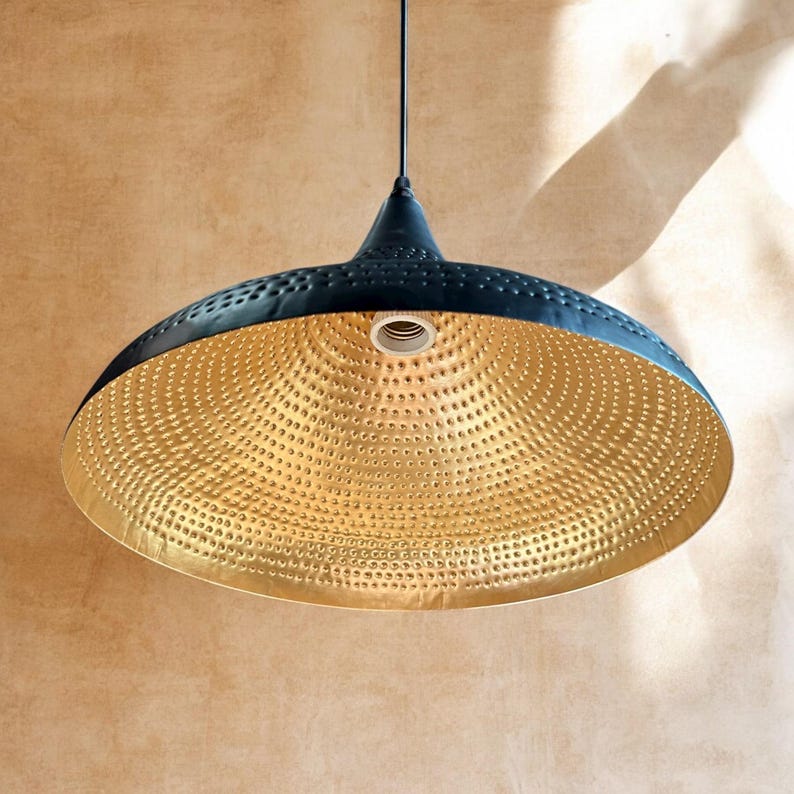Add a touch of modern elegance to your home with this handmade black brass pendant light. The dome shade features a sleek black exterior pierced with fine holes that create a subtle decorative texture, while the golden brass interior reflects a warm and inviting glow.