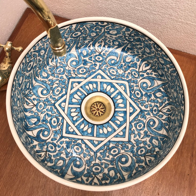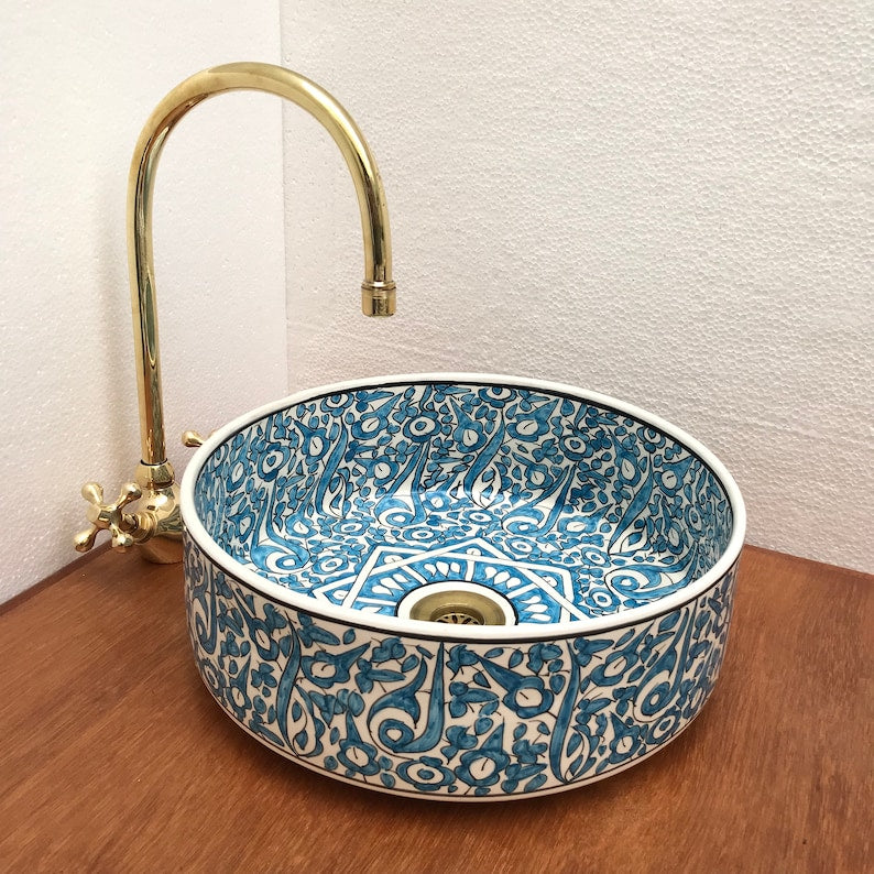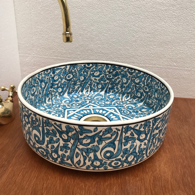 Blue Moroccan Ceramic Vessel Sink: Hand-Painted Bathroom Basin