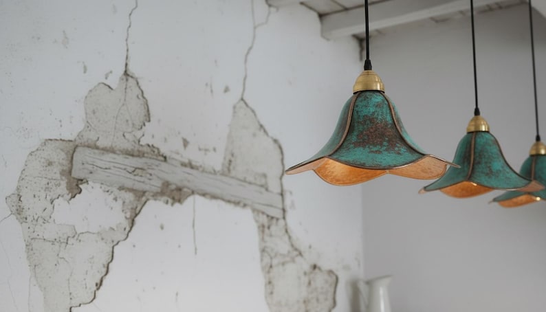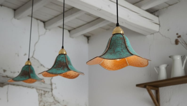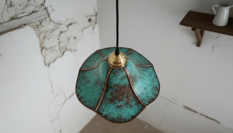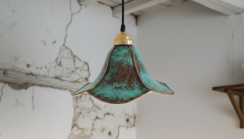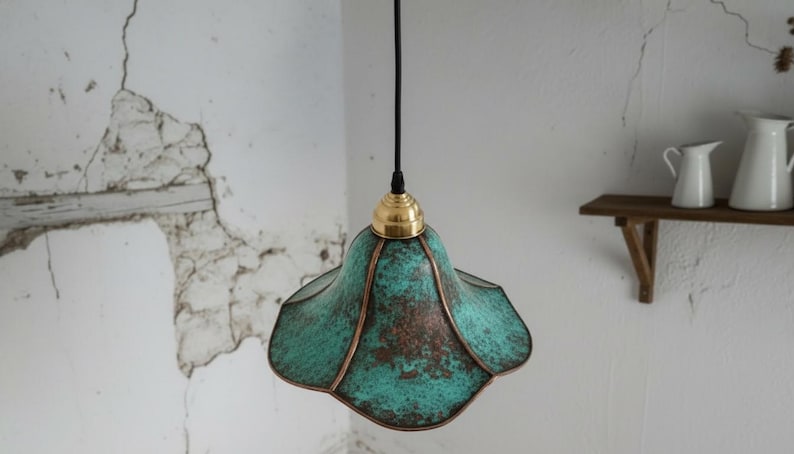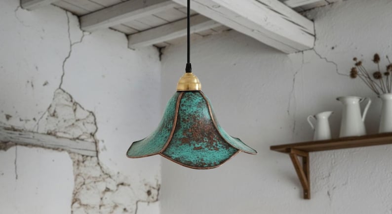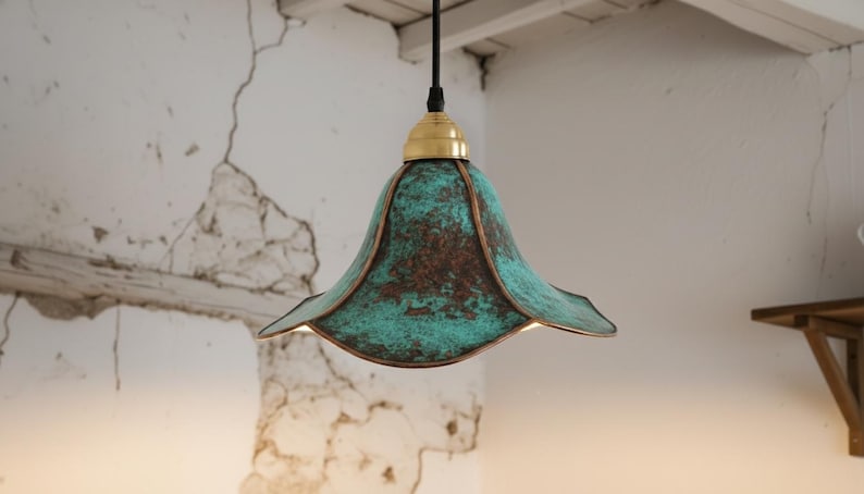 This handcrafted brass pendant light features a rich blue-green patina finish that makes every piece unique. The softly flared dome shade creates a warm, focused glow—perfect above a kitchen island, dining table, breakfast nook, entryway, or bedside corner.