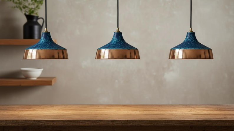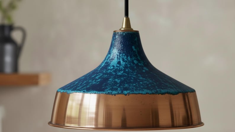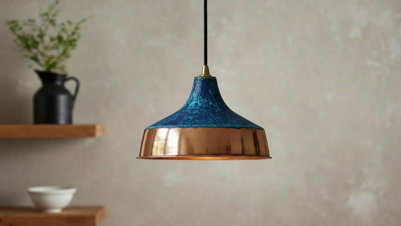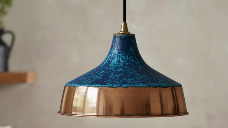 Add a rich pop of color to your space with this handcrafted pendant light, featuring a deep blue patina top and a warm polished copper lower band. The two-tone finish creates a bold, modern look, while the copper interior reflects light beautifully for a cozy glow and strong downward illumination.