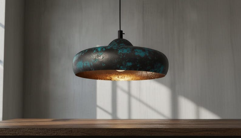 Elevate your space with this handcrafted copper pendant light featuring a deep black finish with rich blue/teal patina accents for a bold, modern look. The wide dome shade creates strong downward lighting, while the hammered warm-gold interior reflects light beautifully and adds a cozy glow. Ideal for kitchen islands, dining tables, bars, entryways, lofts, and modern rustic interiors. Each pendant is handmade, so the patina pattern and color depth will vary slightly—making every piece unique and full of artisan character.