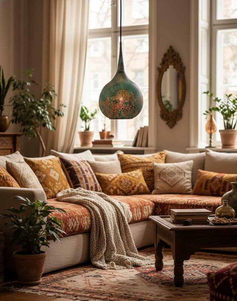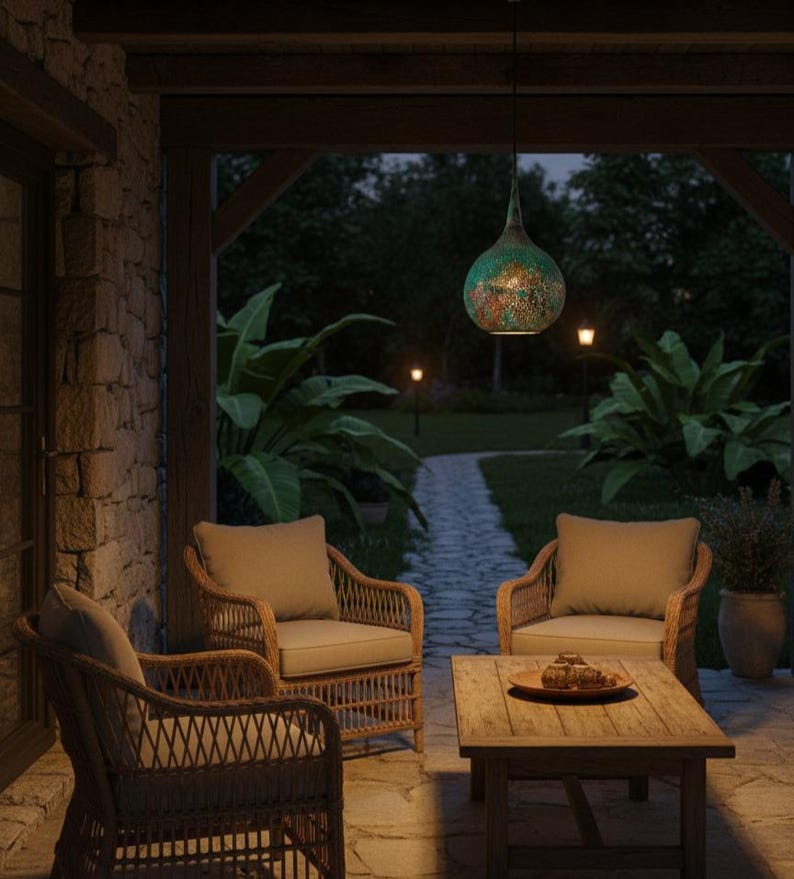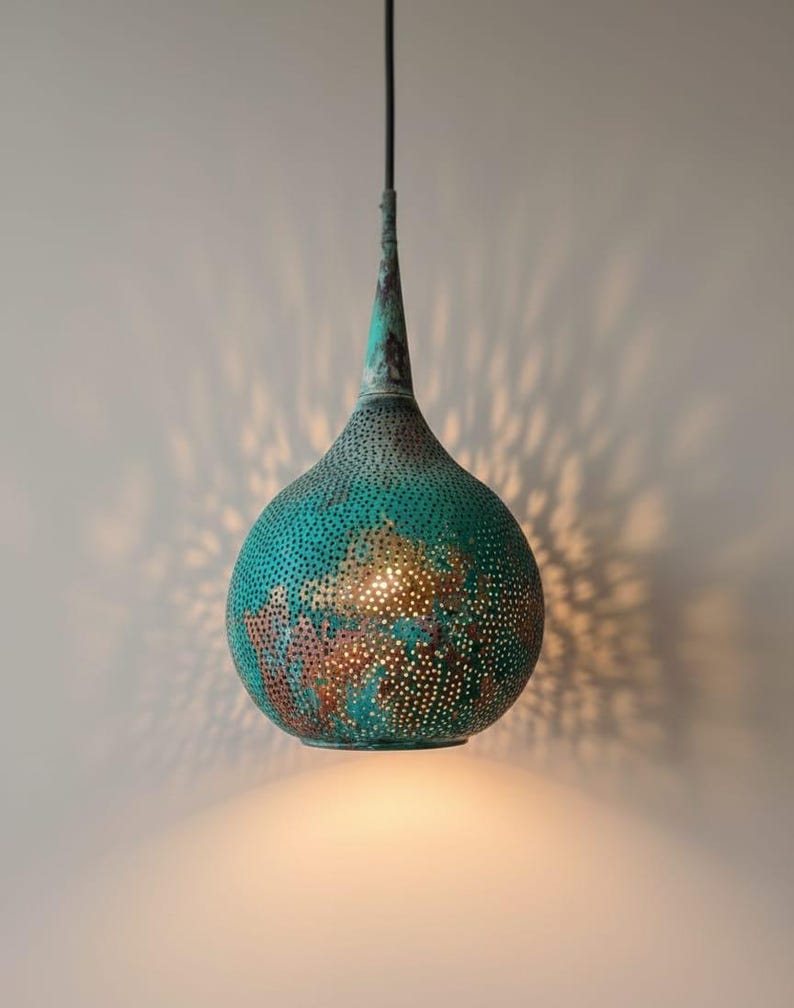 Handmade perforated brass pendant with a stunning blue-green patina finish that casts beautiful shadow patterns on the walls. A perfect statement light for bedrooms, entryways, dining spaces, or cozy reading corners—warm glow, artisan character, and one-of-a-kind texture.