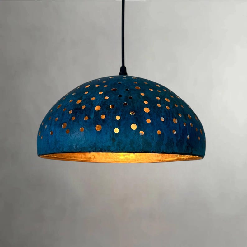 Make a bold statement with this handcrafted copper pendant light finished in a rich blue patina. The dome shade is hand-pierced with mixed-size holes that create a beautiful dotted glow when the light is on, adding atmosphere without being harsh. Inside, the shade is finished in a warm golden tone to enhance brightness and give a cozy, inviting feel. Perfect over a dining table, kitchen island, bar area, entryway, or in a modern bedroom—this pendant blends Moroccan artisan work with contemporary style. Each piece is handmade, so the patina tones and perforation pattern may vary slightly, giving you a truly unique light fixture.