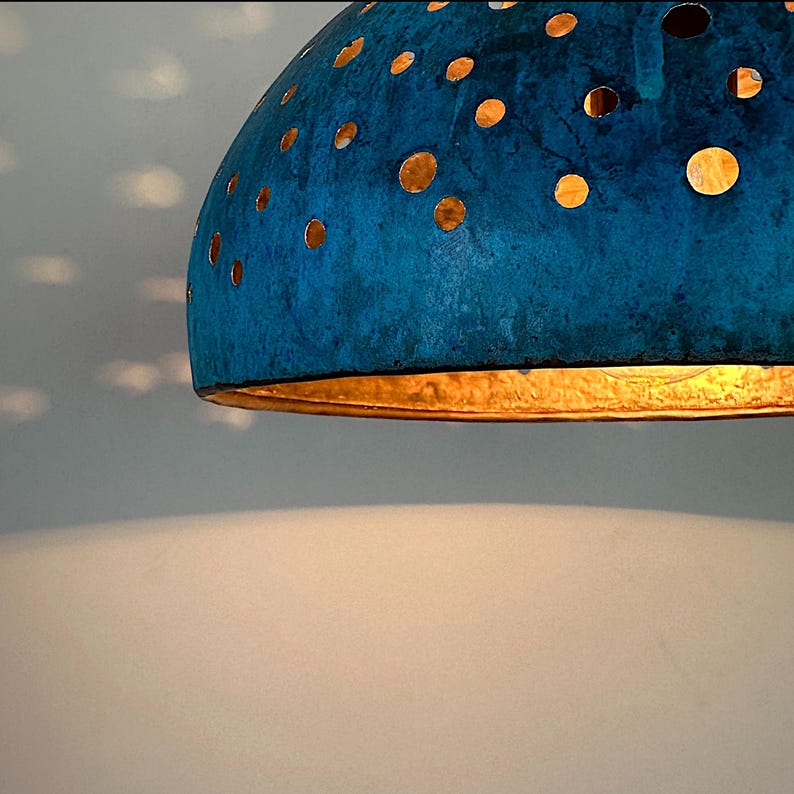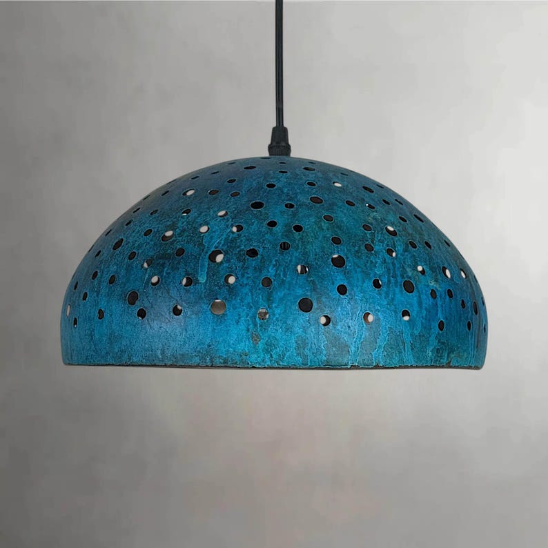 Blue Patina Pierced Copper Pendant Light – Warm Gold Interior