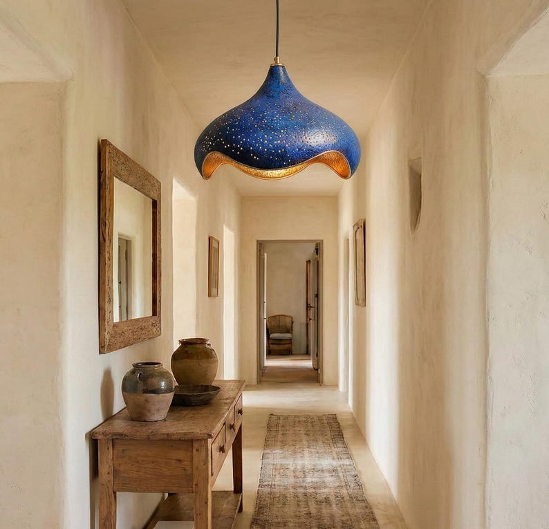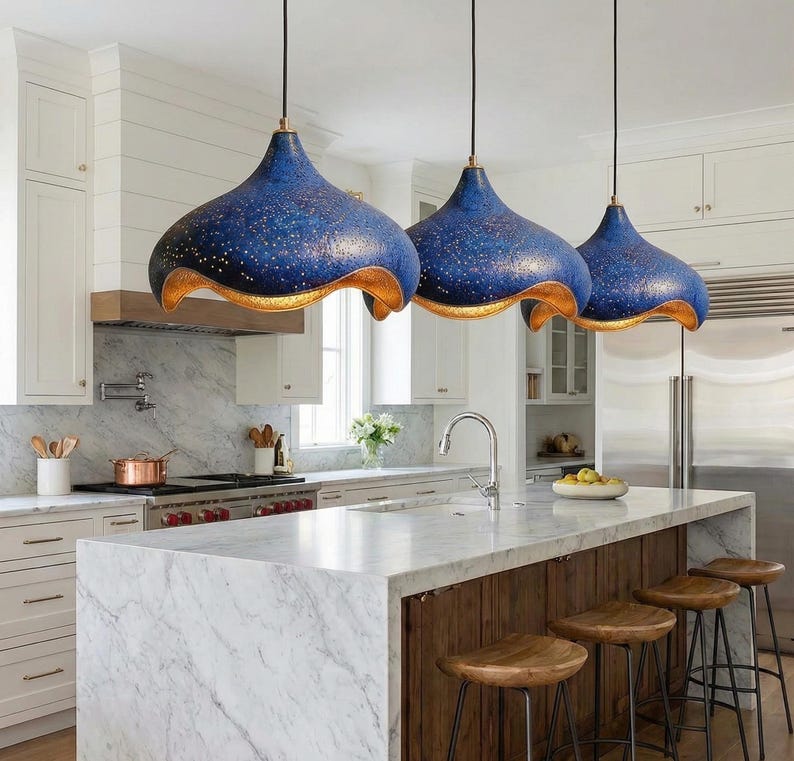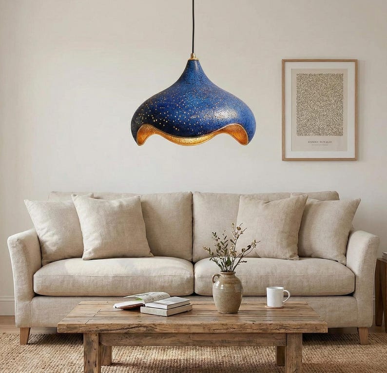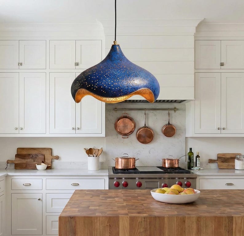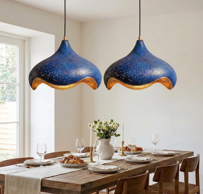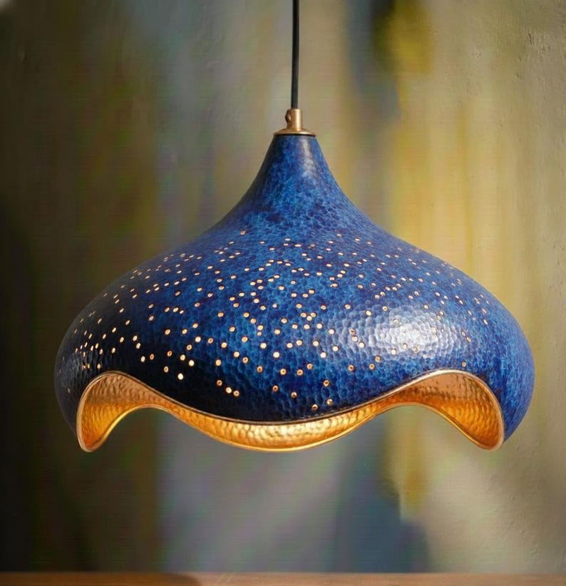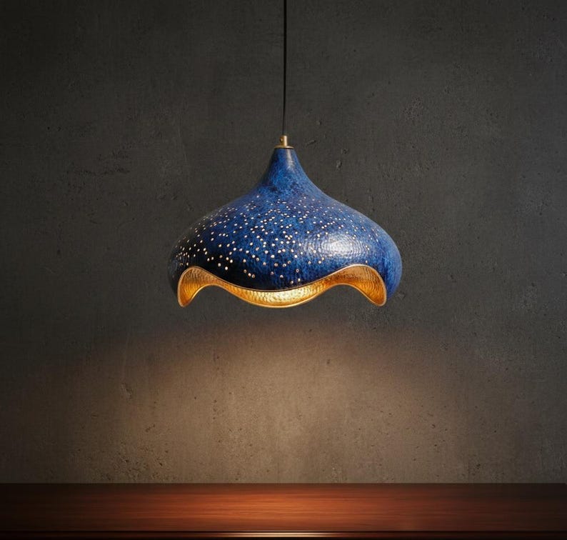 A true statement piece with a soft, artistic silhouette. This handcrafted copper pendant features a deep blue patina finish with delicate pierced “star” dots that sparkle when the light is on. The scalloped, wavy rim adds a unique floating look, while the hammered copper interior reflects a warm golden glow downward—perfect for kitchen islands, dining tables, bedroom corners, entryways, or boutique/café lighting. Each light is handmade and patinated by hand, so the tone and pattern will vary slightly, making every pendant one of a kind.