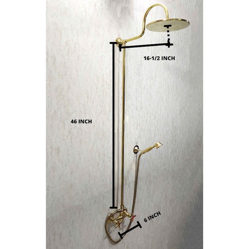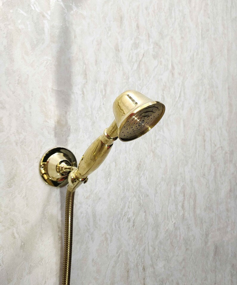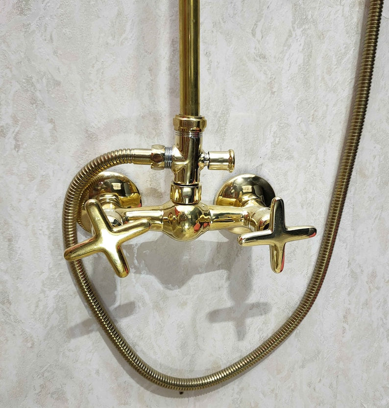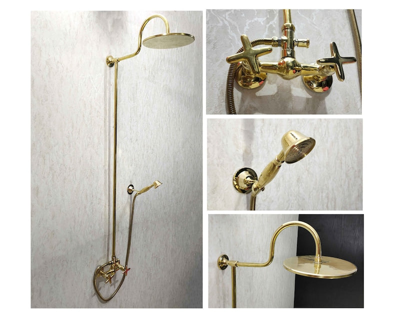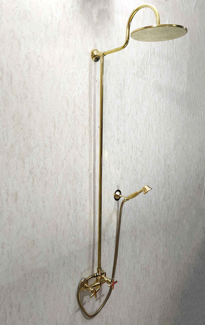 Elegant exposed-pipe shower system crafted from solid brass with a wide rainfall shower head and matching handheld sprayer on a flexible hose. Timeless wall-mounted design—ideal for luxury bathrooms and vintage-inspired remodels. Custom height, pipe layout, and finishes available on request.