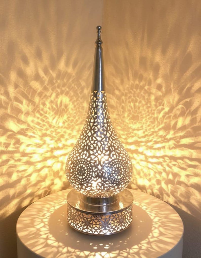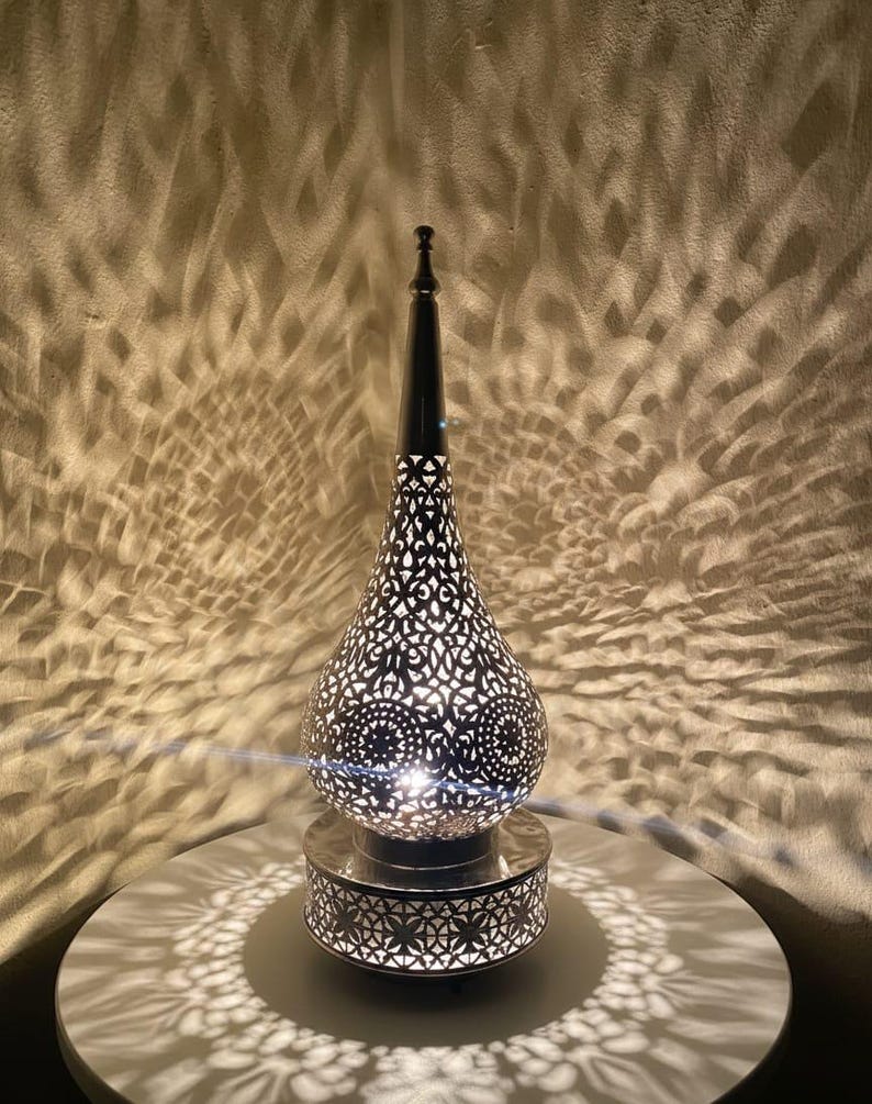 A highly decorative silver-toned metal lantern or lamp with intricate, handcrafted filigree (cutout) patterns. It features a teardrop-shaped body that tapers to a tall spire and rests on a circular base with a geometric floral design. The style is characteristic of Moroccan or Middle Eastern craftsmanship, designed to cast beautiful, patterned light.