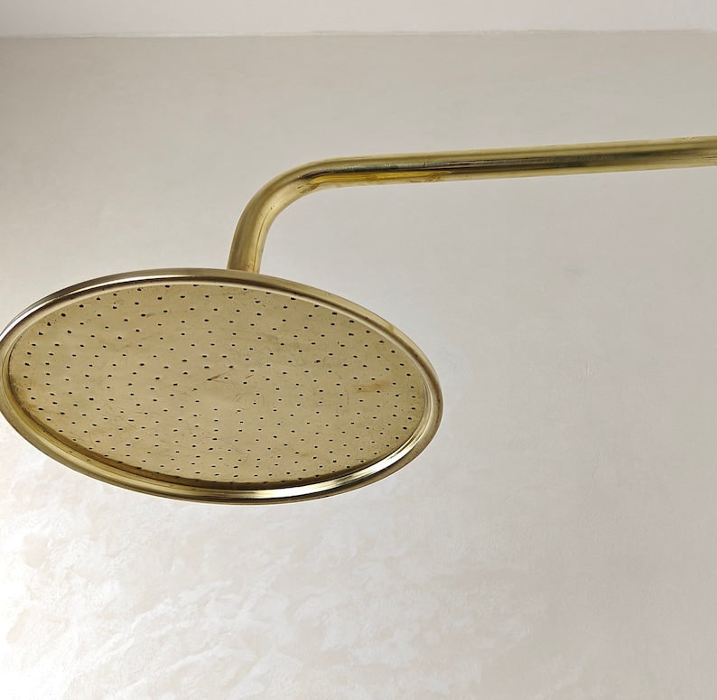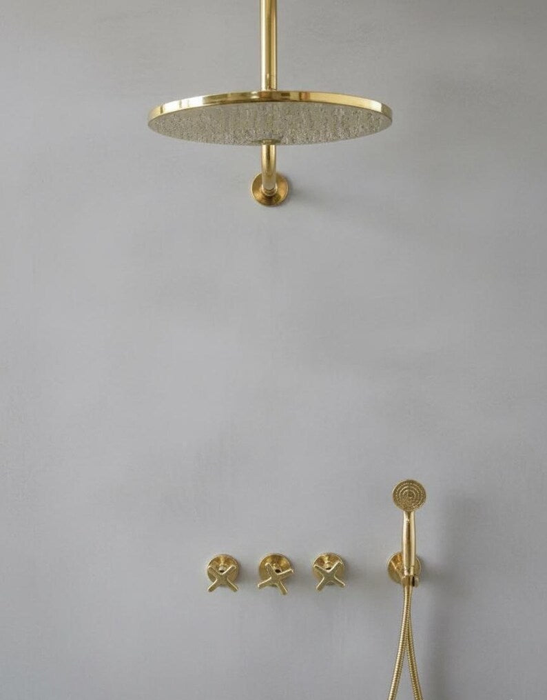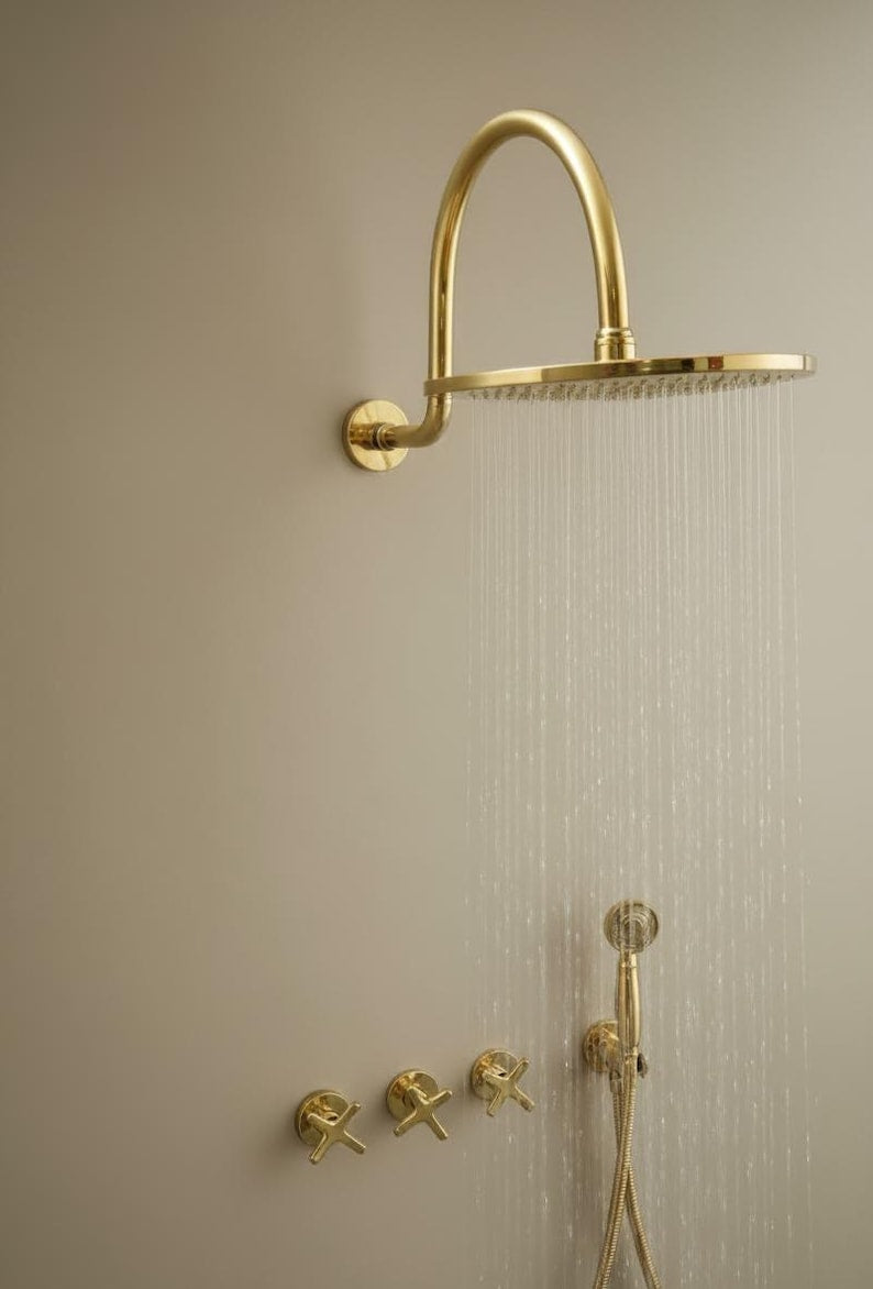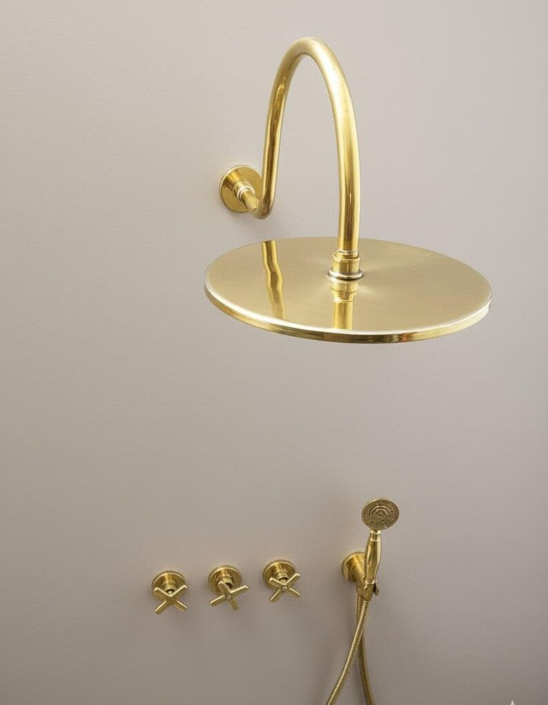 Luxury shower system crafted from solid brass with a wide rainfall shower head, matching handheld sprayer, and classic cross handles for precise control. Timeless elegant look with a spa-style rain flow—perfect for high-end bathroom remodels.