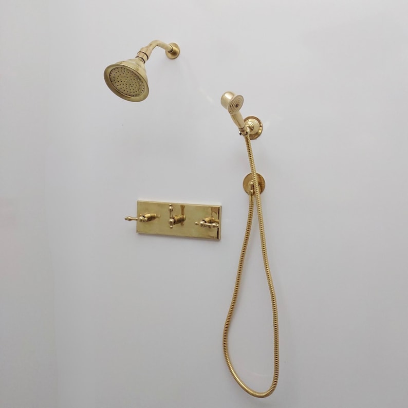 Elegant solid brass shower set featuring a wall-mounted shower head, matching handheld sprayer with flexible hose, and a 3-control valve plate for easy switching and temperature control. Clean, timeless design for modern or classic bathrooms. Custom finishes and configurations available on request.