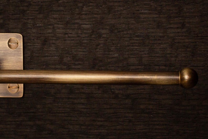 High quality, American-finished brass: 3/8” diameter rod, 1” x 2” mounting plate with countersunk holes. This brass is not coated and will patina with time. However, there is a lacquered option available.