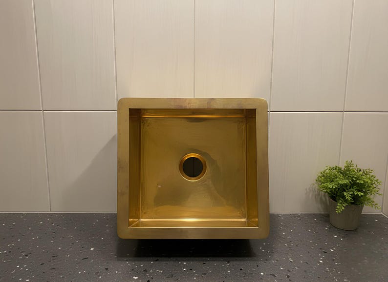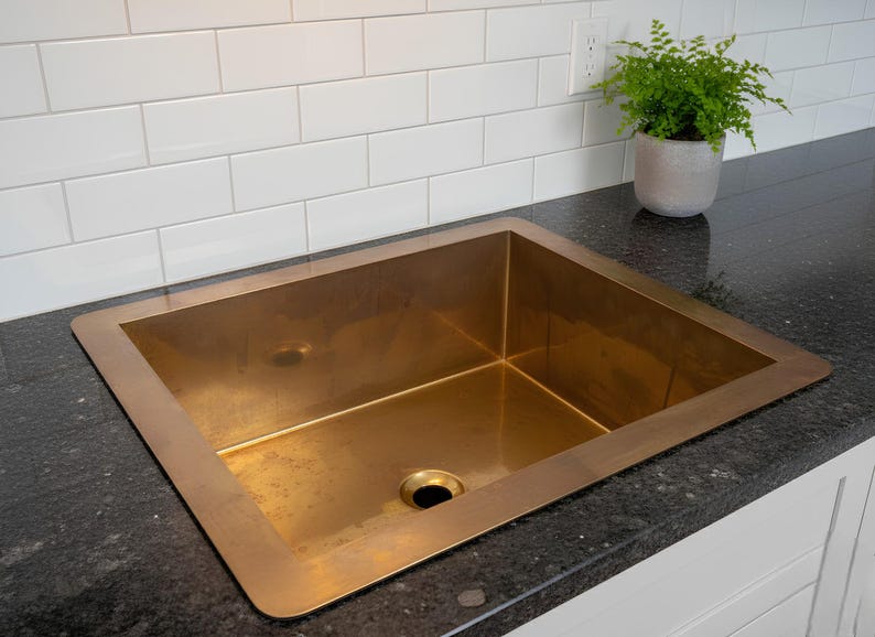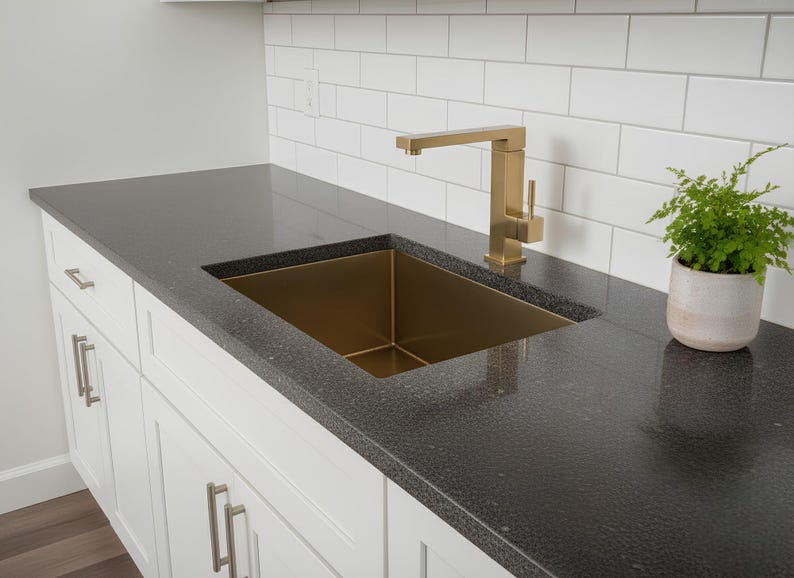 Upgrade your kitchen with a sleek brushed gold undermount single-bowl sink designed for modern living. With its clean rectangular shape and premium gold tone, this sink creates an elegant contrast against stone countertops like quartz, granite, or concrete.