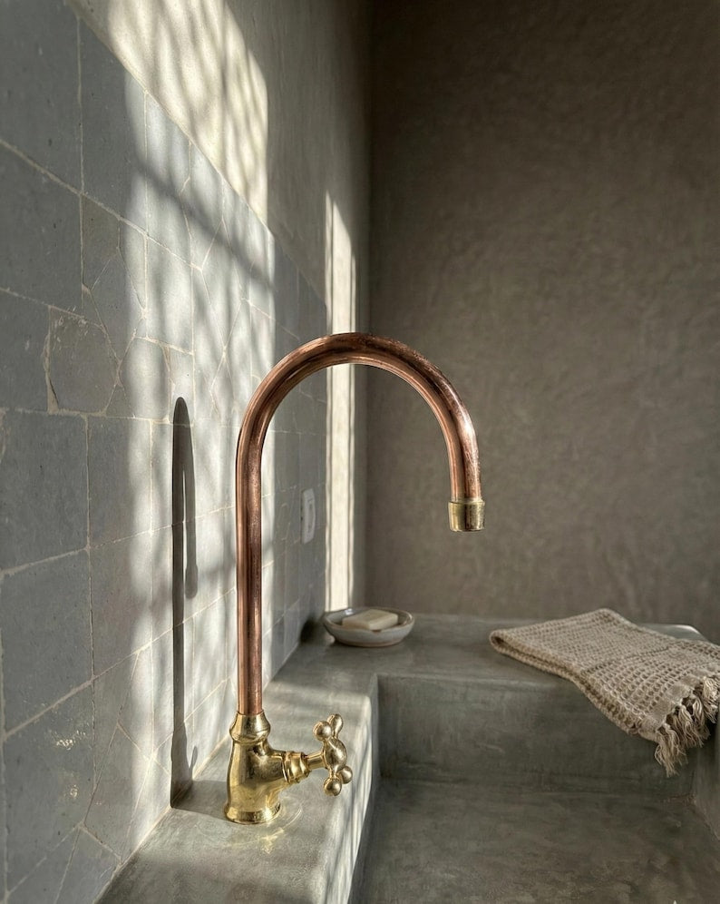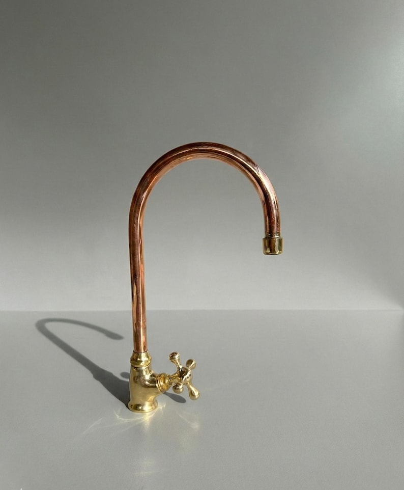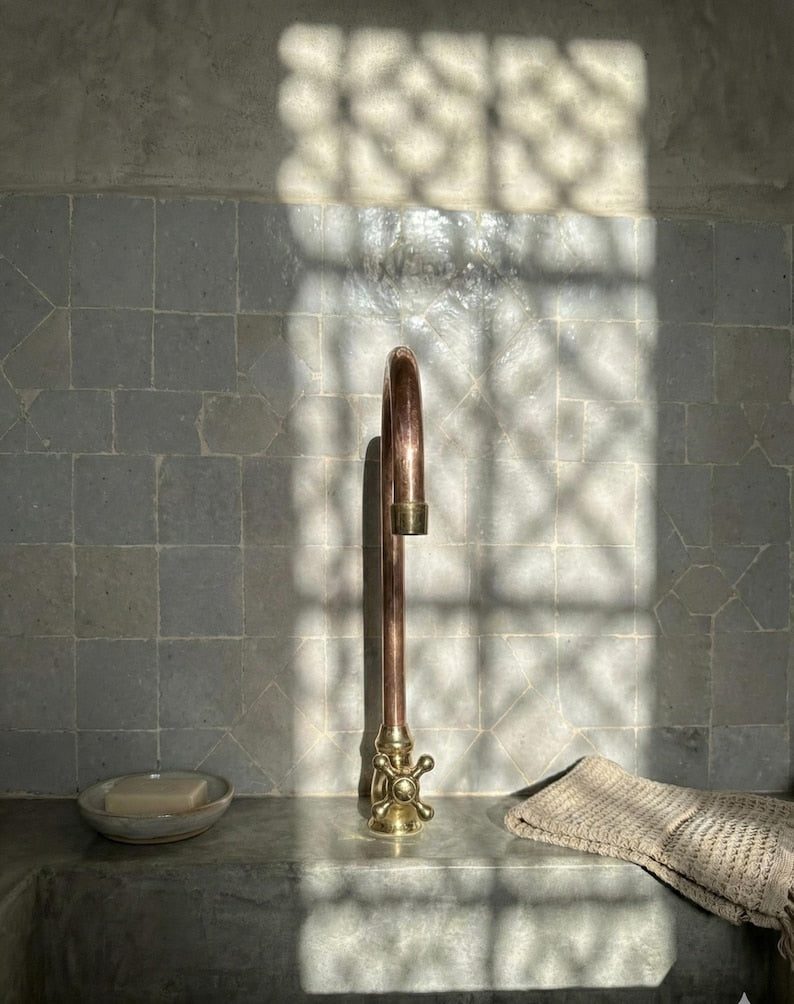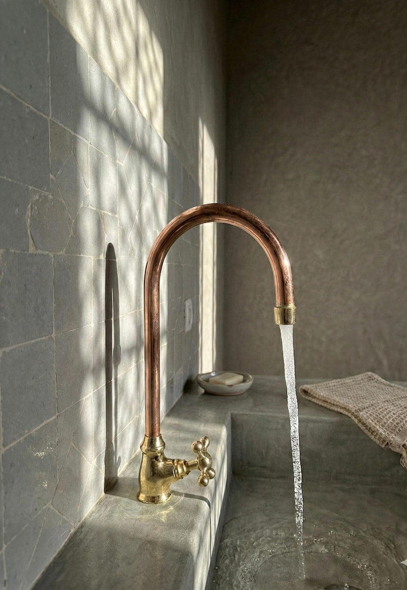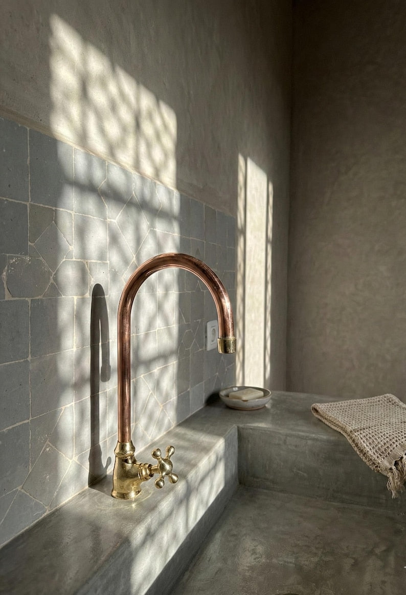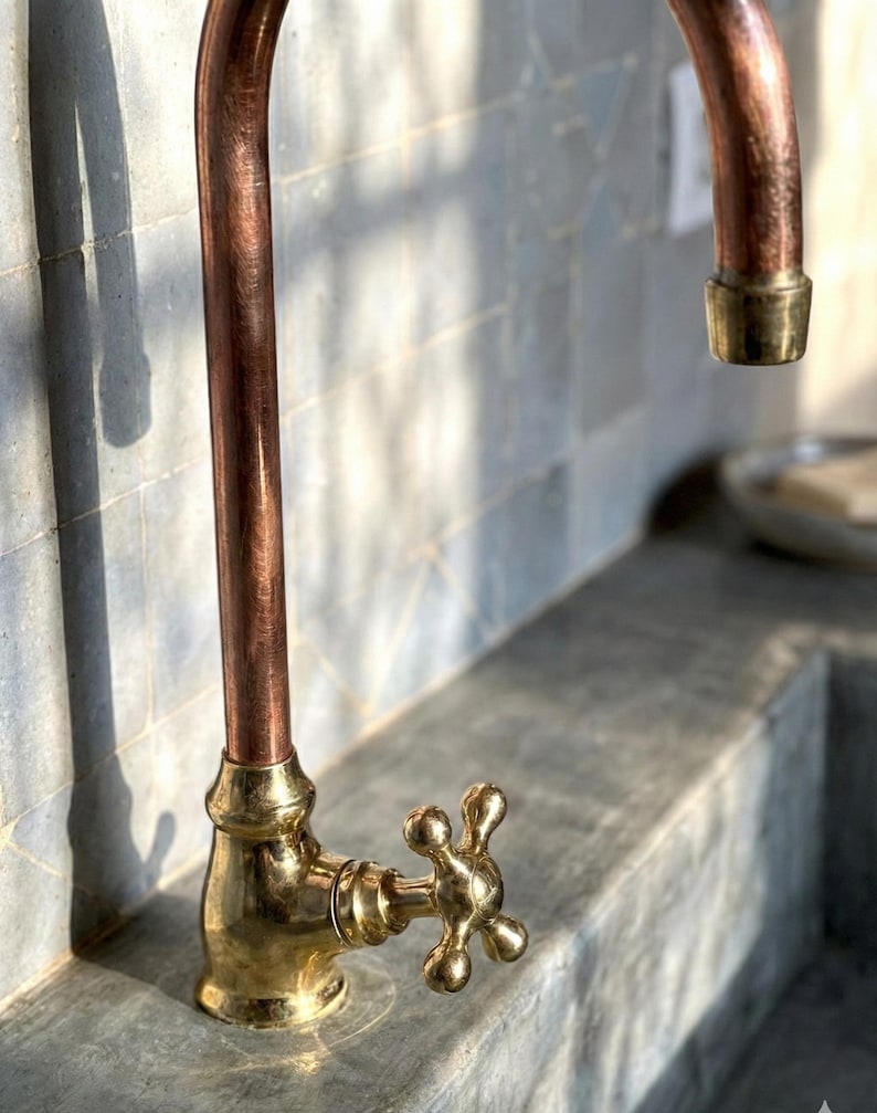 Made in Marrakech using traditional metalworking techniques, this faucet features a tall curved copper spout paired with a solid unlacquered brass base — a beautiful blend of rustic charm and modern minimalism.