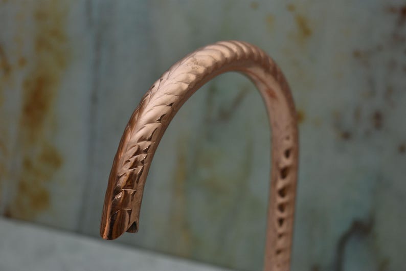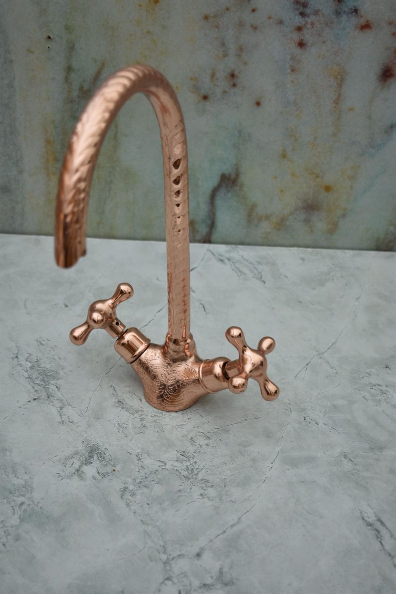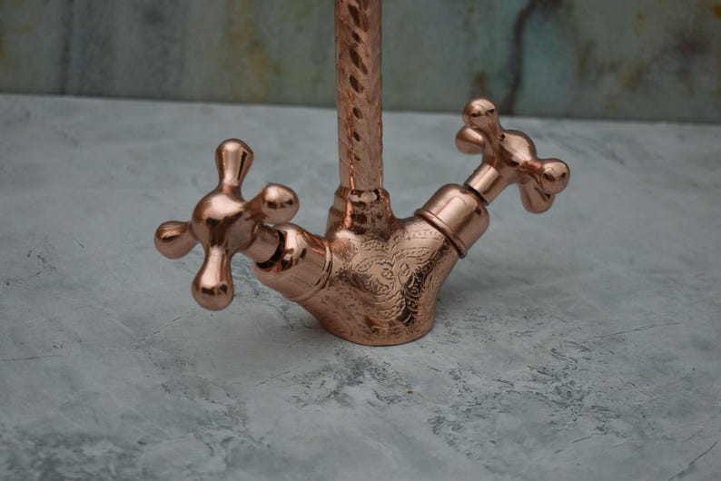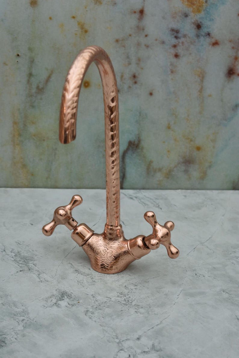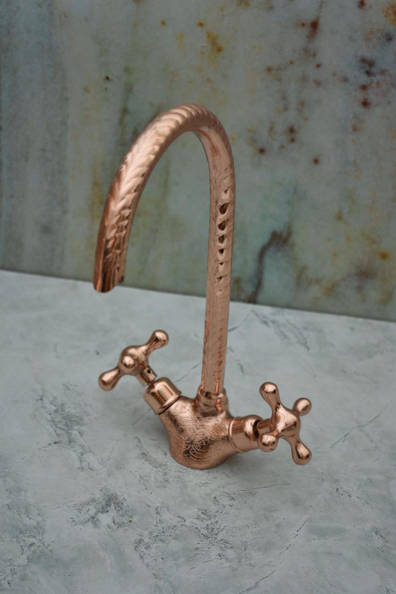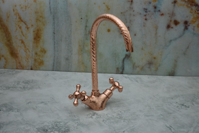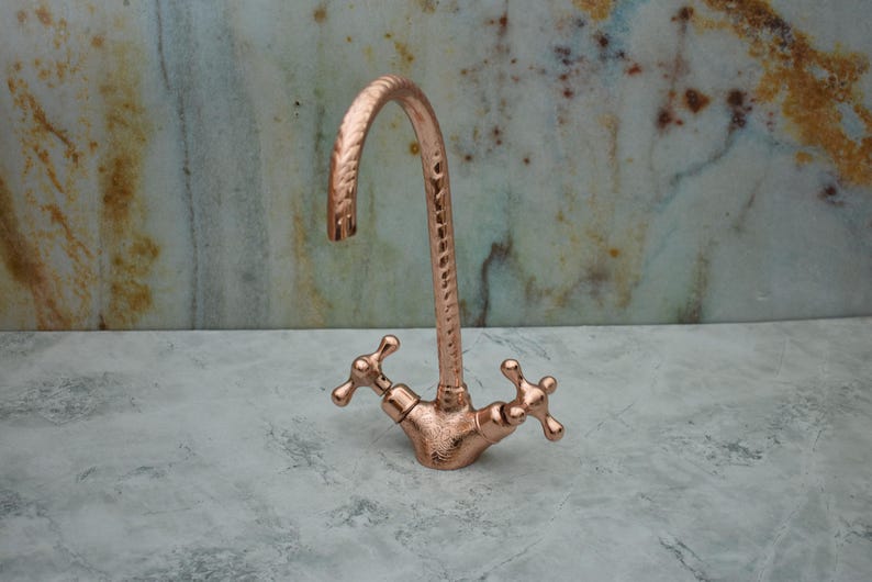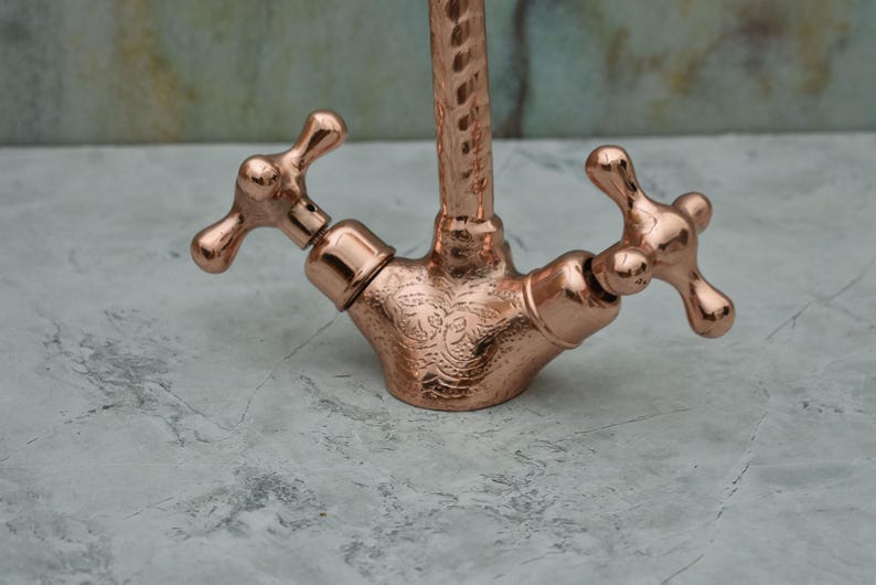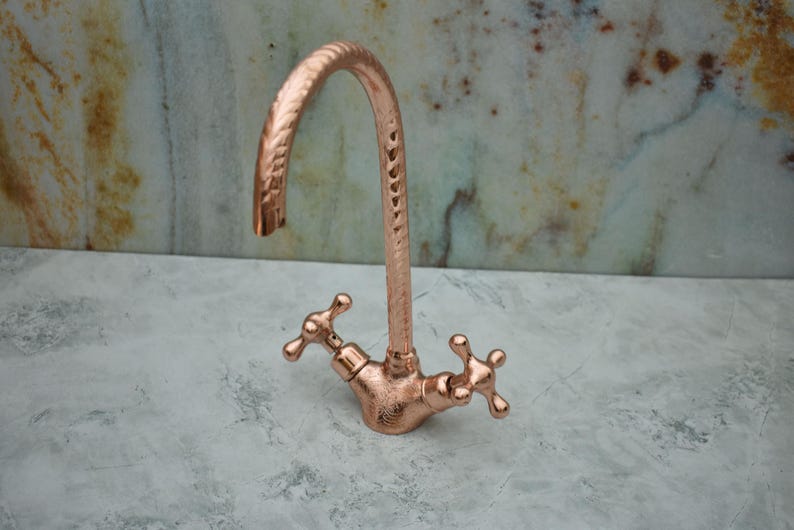 This faucet is 100% handmade of Copper, it gets warm patina overtime. It will add an elegant, charming and antique decoration to your space.