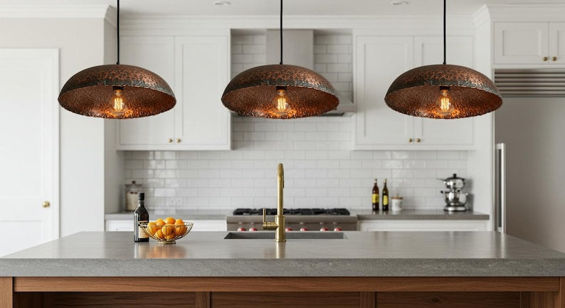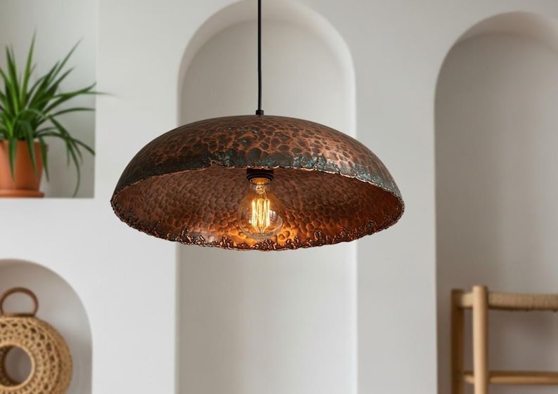 This copper pendant light doesn’t just brighten a room — it transforms it. The warm glow and rustic finish create a cozy, inviting atmosphere that blends old-world charm with modern elegance. Whether it’s over a kitchen island, in a dining space, or an entryway, it sets a mood of timeless sophistication and handcrafted beauty.