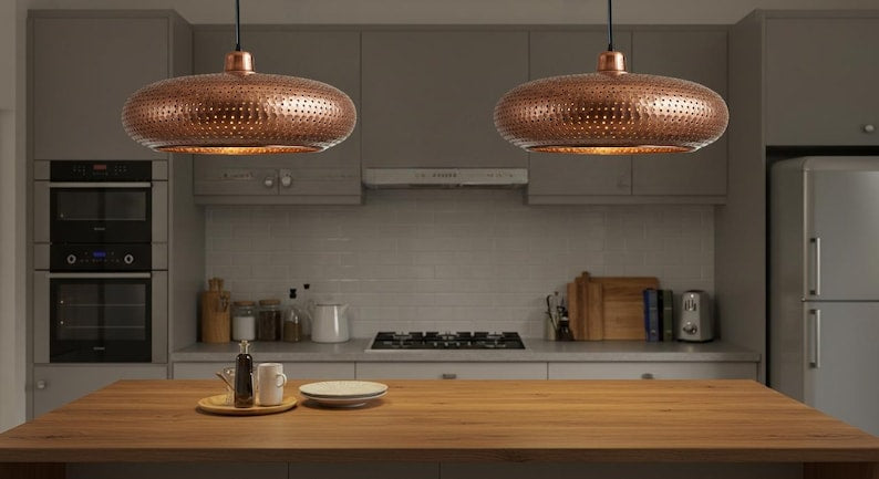 Add warmth and sophistication to your kitchen with this stunning copper pendant light featuring an intricate perforated design. The hand-hammered copper finish creates beautiful light patterns while providing ambient illumination perfect for kitchen islands, dining areas, and contemporary living spaces.