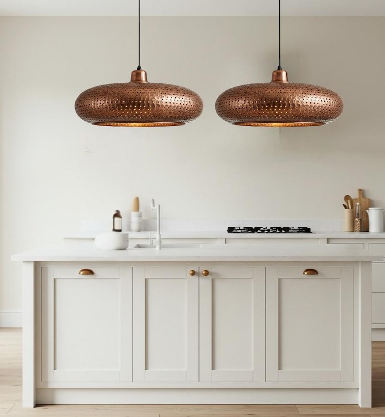 Copper Pendant Light: Perforated Shade, Modern Kitchen Island Lighting