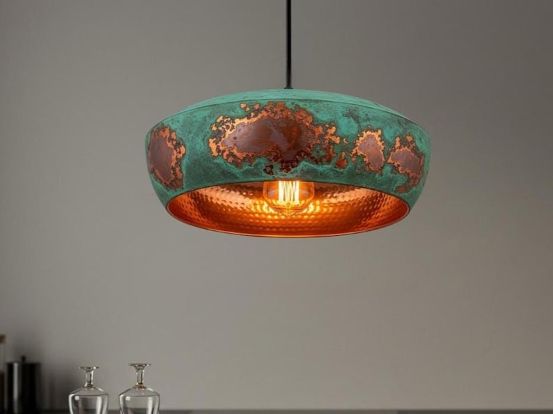 Dome Pendant Light – Patina Green Copper Hanging Lamp – Hammered Handmade Ceiling Light Fixture