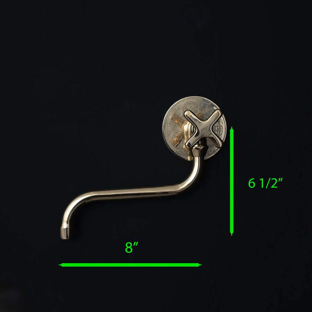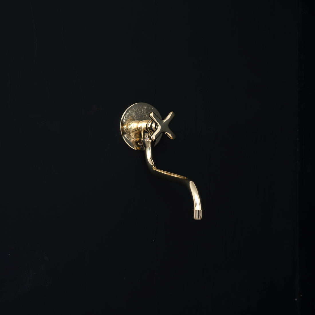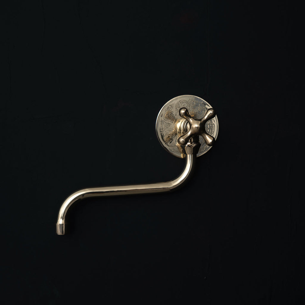 A traditionally designed, highly functional, unlacquered brass pot filler with a downward spout and decorative escutcheon provides a luxurious kitchen experience.