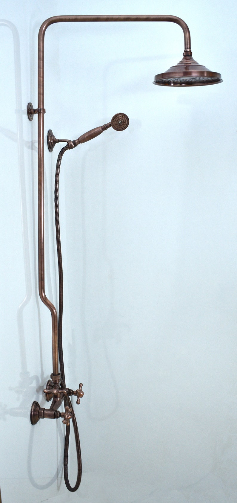 The shower faucet comes with brackets to fix the Copper pipe to the wall. Designed to be used with standard US Plumbing.
