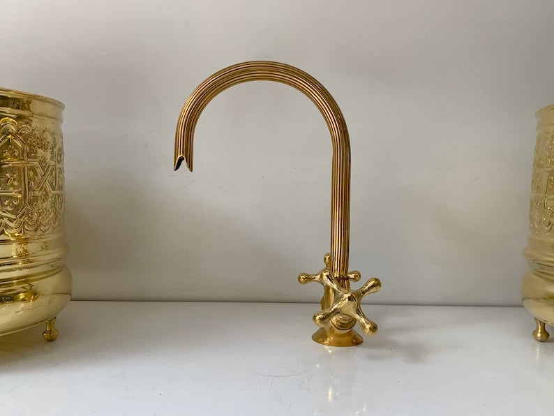 Gooseneck Bathroom Vanity Solid Brass Faucet, Unlacquered Brass with Single Cross Handles