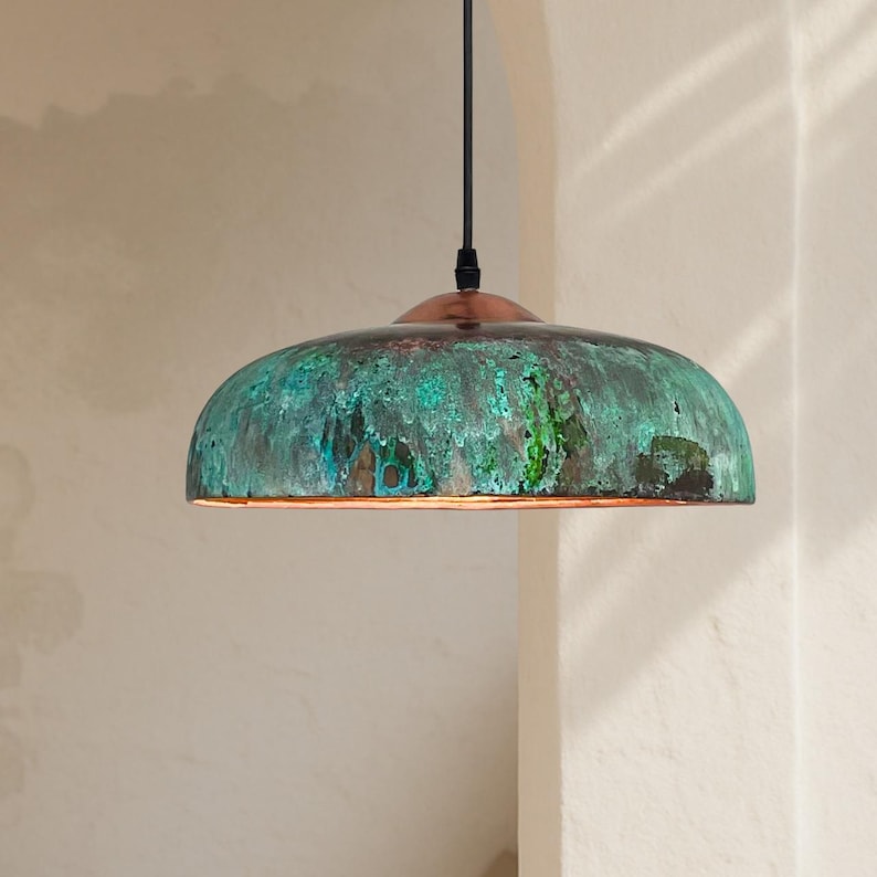 Green Copper Farmhouse Light,Green Patina Copper Pendant Lamp, HandCrafted Rustic Copper Island Light, Rustic Dome Pendant Light Fixture