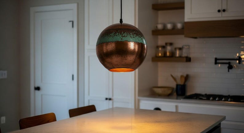 This copper pendant light doesn’t just brighten a room — it transforms it. The warm glow and rustic finish create a cozy, inviting atmosphere that blends old-world charm with modern elegance. Whether it’s over a kitchen island, in a dining space, or an entryway, it sets a mood of timeless sophistication and handcrafted beauty.