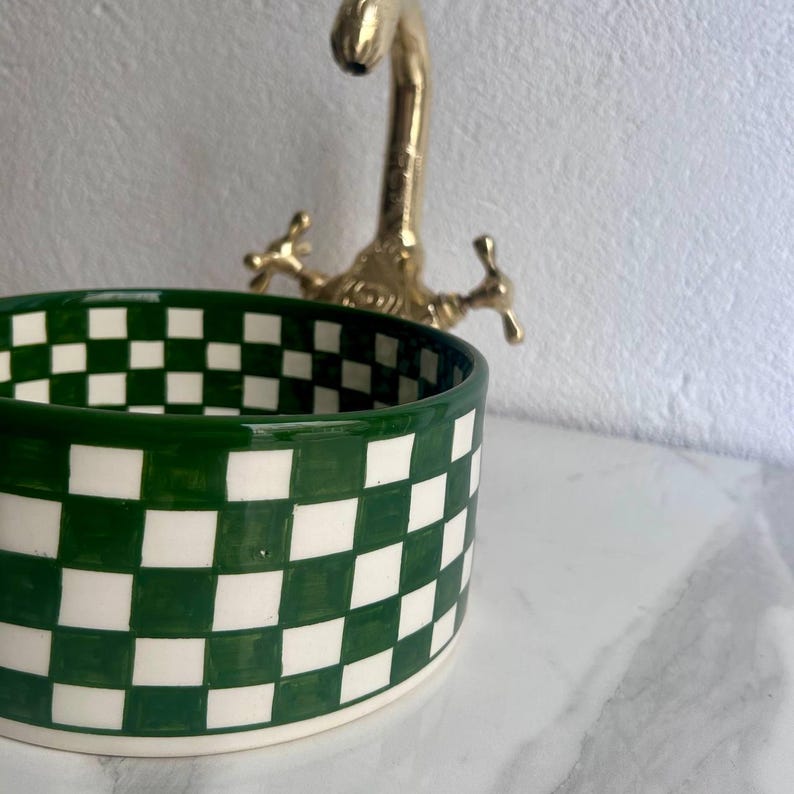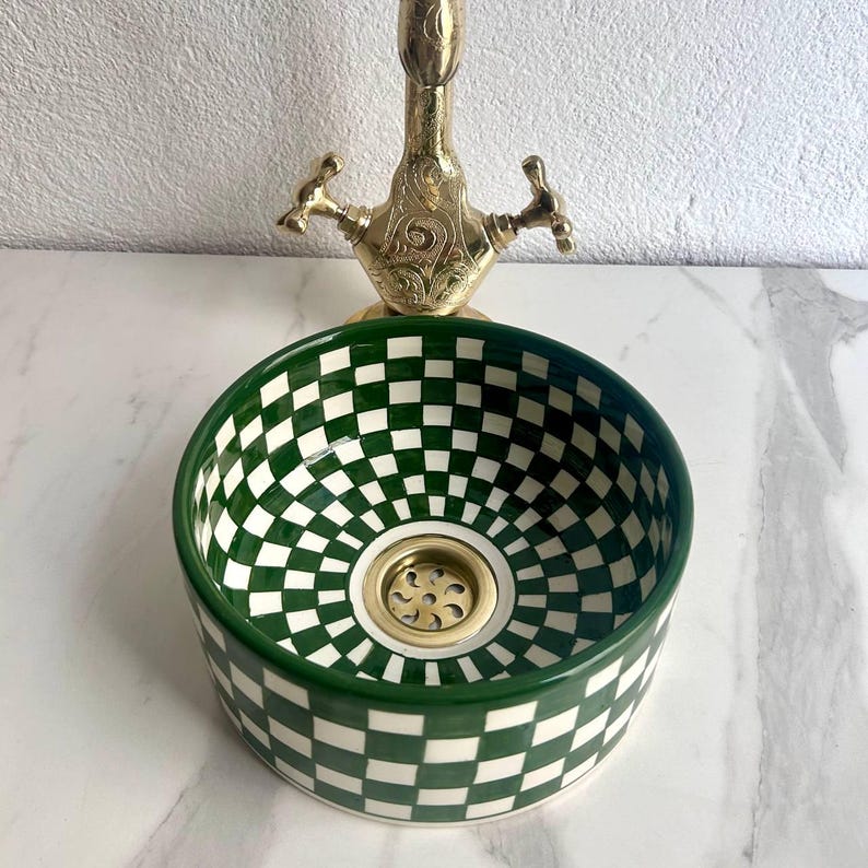 Bring artistic charm and functional beauty into your bathroom with this Green Vessel Sink, a handcrafted bohemian-style ceramic basin thatβs perfect for any modern, rustic, or eclectic space. With its checkered paint pattern and rich green glaze, this hand painted ceramic washbasin stands out as a bold centerpiece for your vanity top, corner sink, or single sink vanity.
