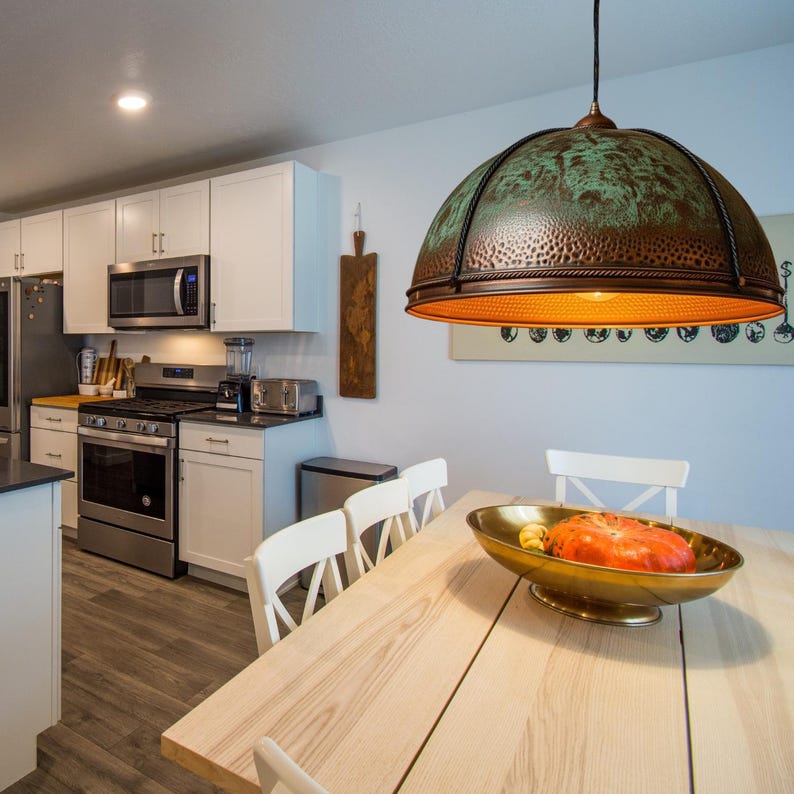 Hammered Copper Dome Pendant Light: Rustic Lodge Chandelier with Verdigris Patina