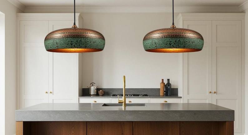 ✨ The rich contrast between the polished copper base and the oxidized green patina top adds character and depth to the lamp, casting a warm, elegant glow. Ideal for kitchen islands, dining rooms, cafes, or entryways.