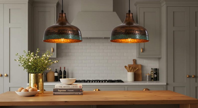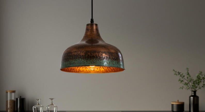 Hammered Copper Pendant Lights with Green Patina Edge | Rustic Industrial Kitchen Island Lighting