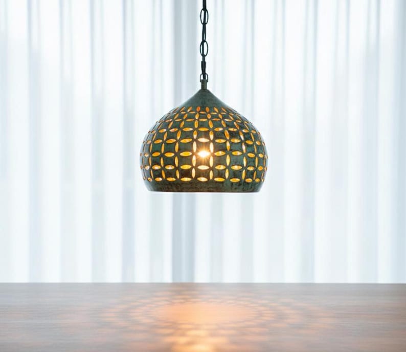 Add timeless elegance and artisan charm to your home with this unique copper pendant light, crafted with a stunning green patina oxidized brass finish. Each lamp is hand-carved with a detailed pattern across the surface, allowing soft, warm light to filter beautifully through the design. The result is a captivating glow that enriches any interior — from a modern kitchen island to a rustic dining room or cozy living space.