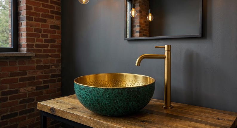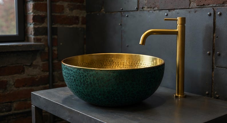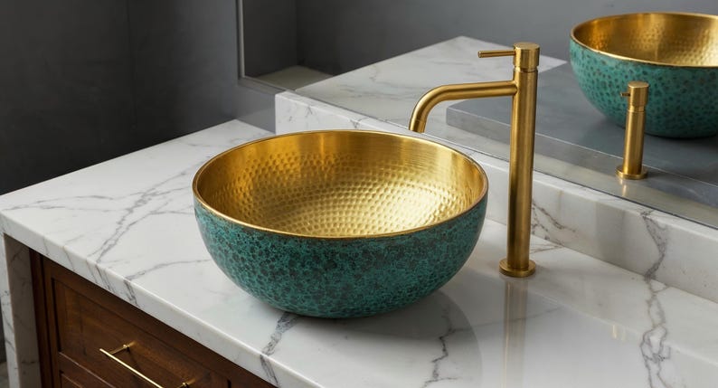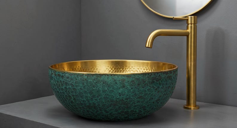 Bring a touch of luxury and vintage charm to your bathroom with this exquisite hand-hammered brass vessel sink. The radiant gold interior offers a warm, reflective glow, while the exterior features a sophisticated green Art Deco-inspired scallop pattern. Crafted with precision and artistry, this above-counter sink is perfect for adding character to modern, eclectic, or classic interiors. Durable, functional, and eye-catching — it’s a true statement piece.