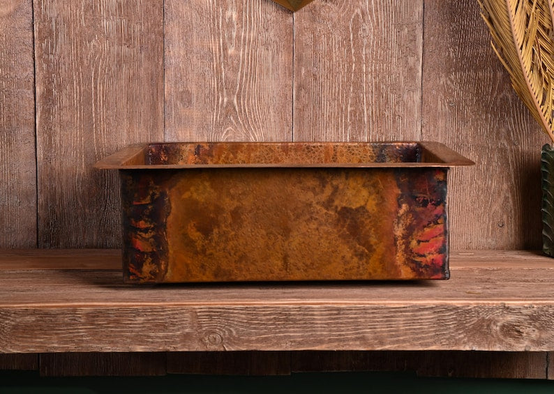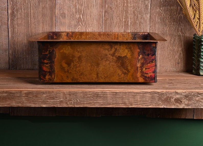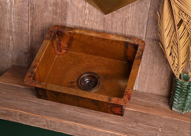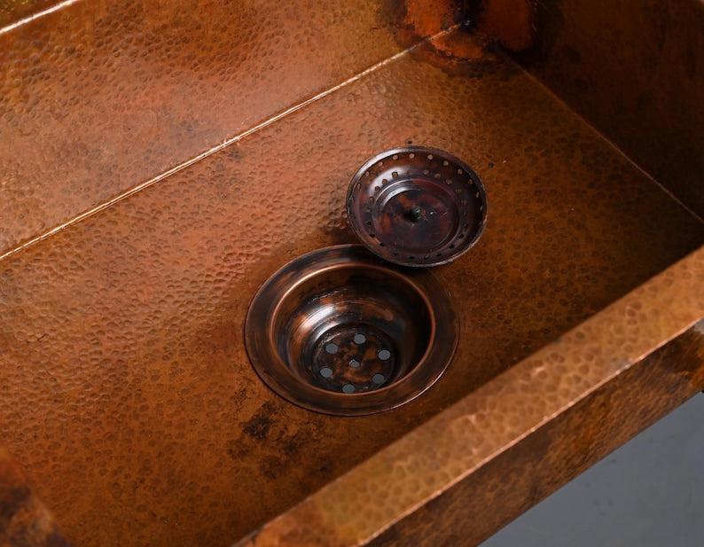 This solid copper kitchen sink is entirely handcrafted and showcases the authentic charm of traditional craftsmanship. Featuring a generous rectangular shape and a hand-hammered finish, it adds a rustic yet sophisticated touch to any kitchen—whether farmhouse-style or modern.
