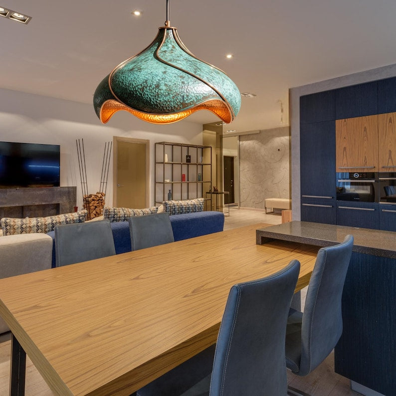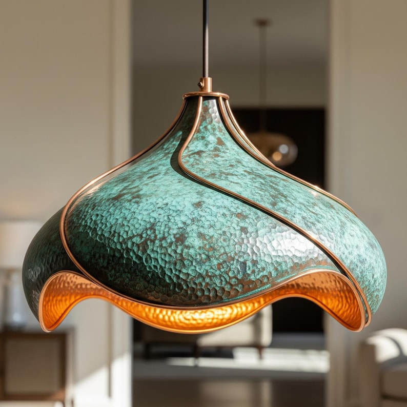 Each lamp is brought to life from a single sheet of solid copper. I meticulously hand-hammer the entire surface to create a rich, tactile texture that plays with light. The shade is then skillfully fluted into an elegant, petal-like form, giving it a graceful sense of movement. The exterior is treated with a special aging process to develop a stunning verdigris patina, a tapestry of deep greens and turquoise tones that evokes a sense of history and grace.