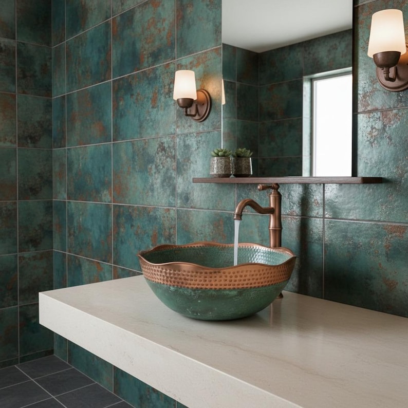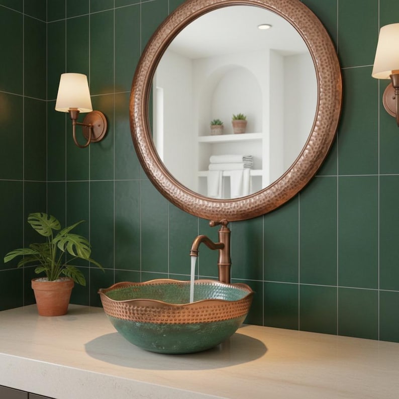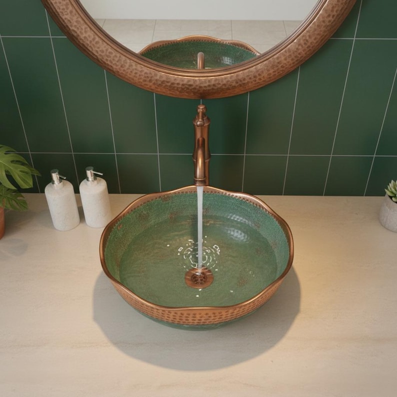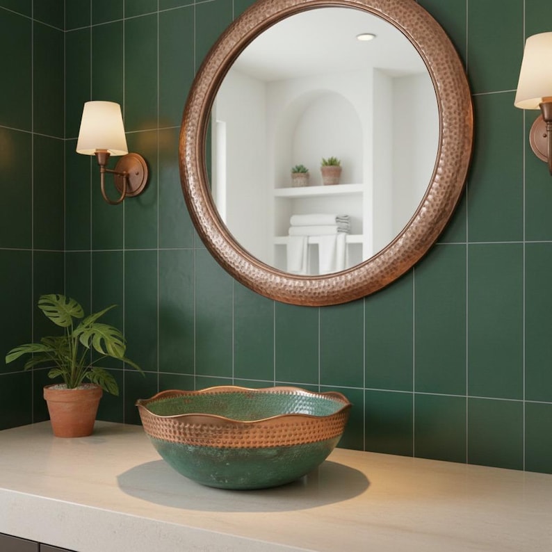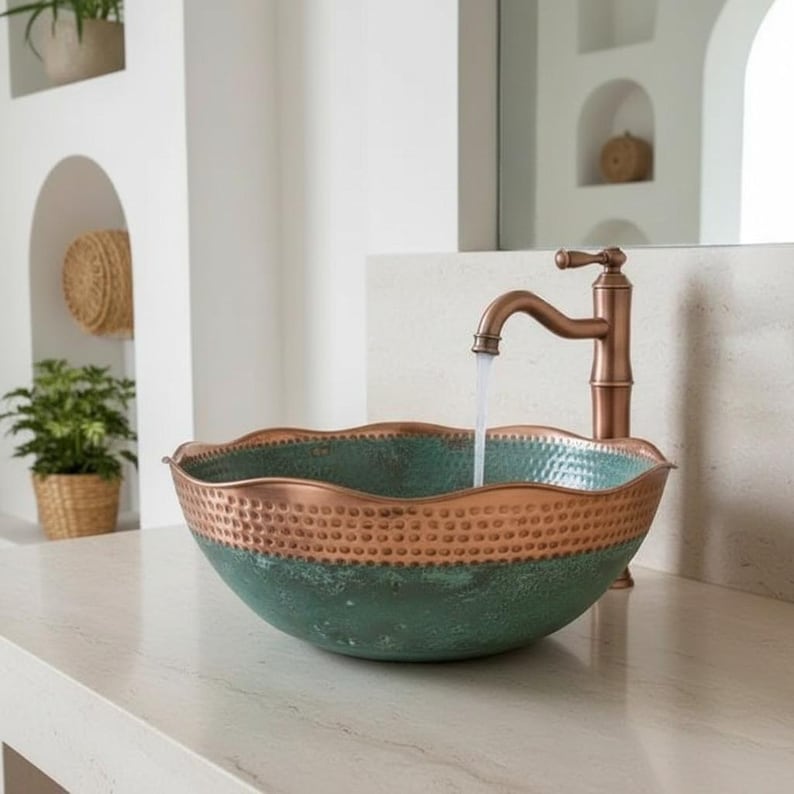 Hand Hammered Copper Wash Basin: Green Patina Finish, Moroccan Style