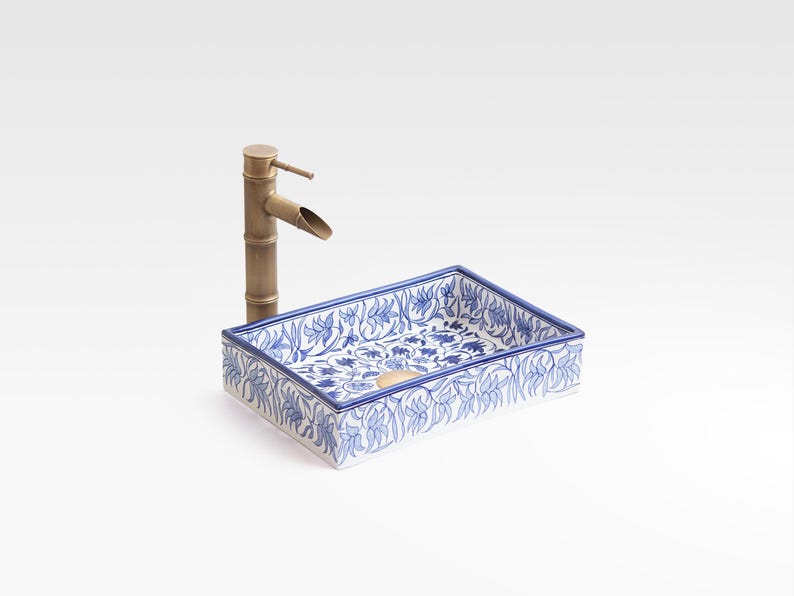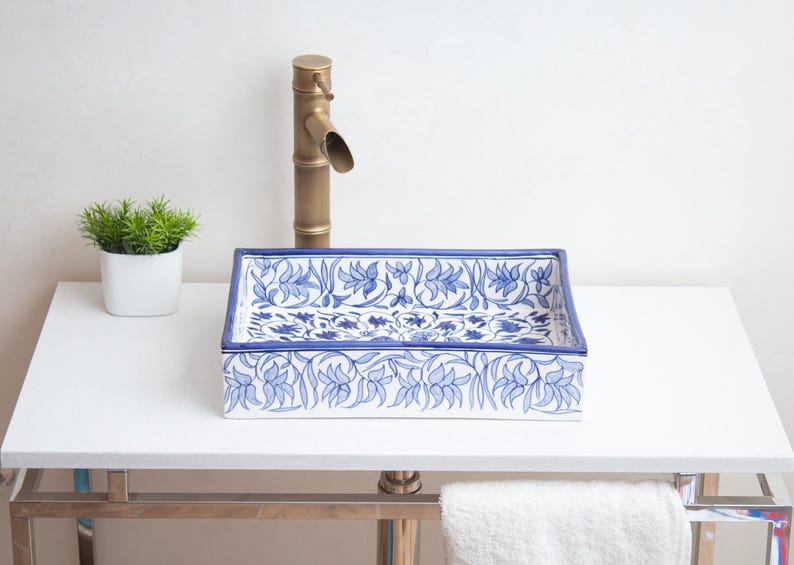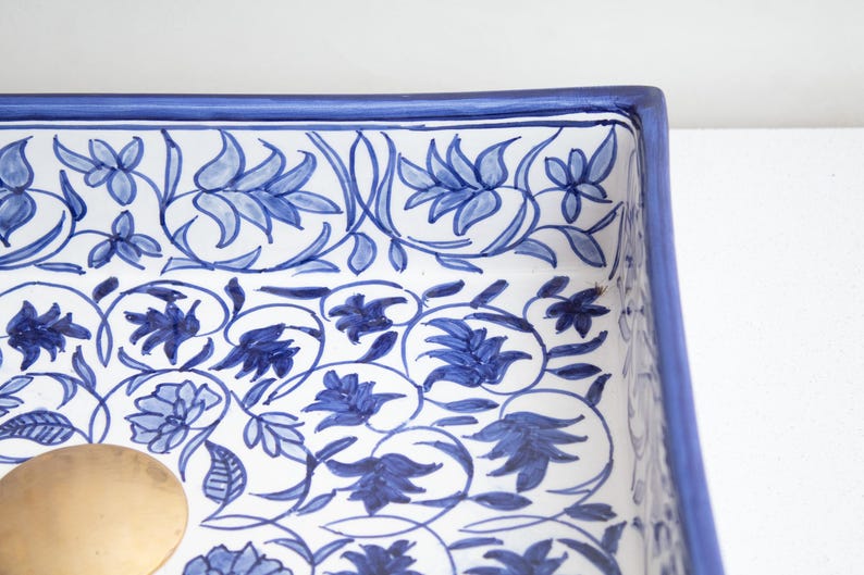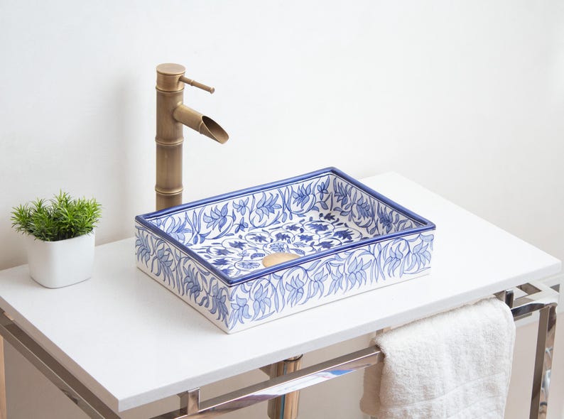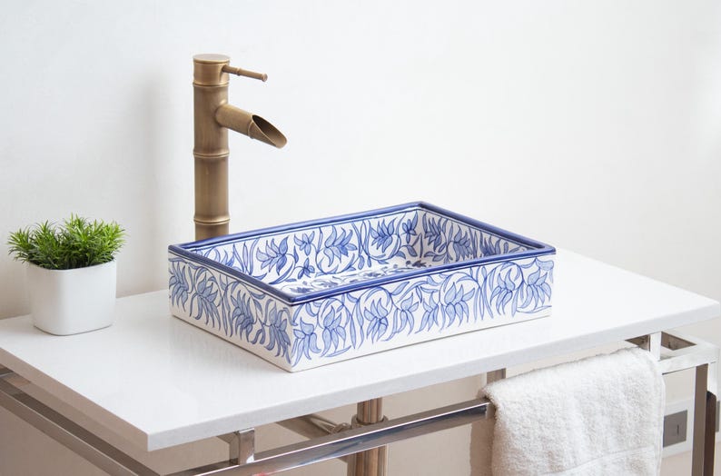 Small Rectangular ceramic washbasin with blue hand painted floral pattern for bathroom vanity. Perfect for small vanity unit and tight bathroom