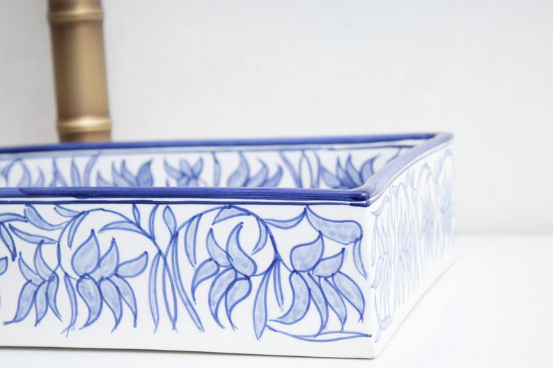 Hand Painted Blue Floral Ceramic Sink: Rectangular Vanity Washbasin