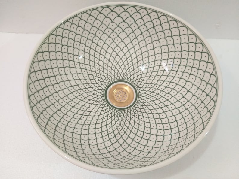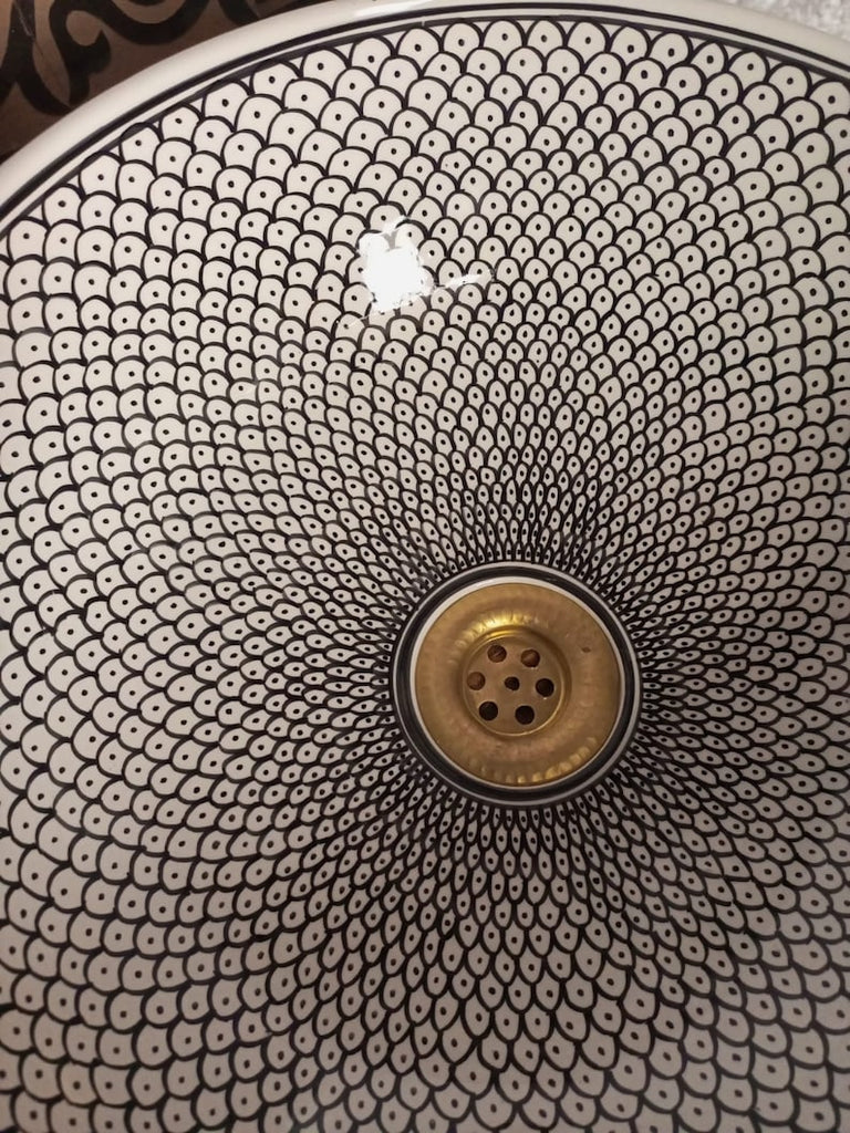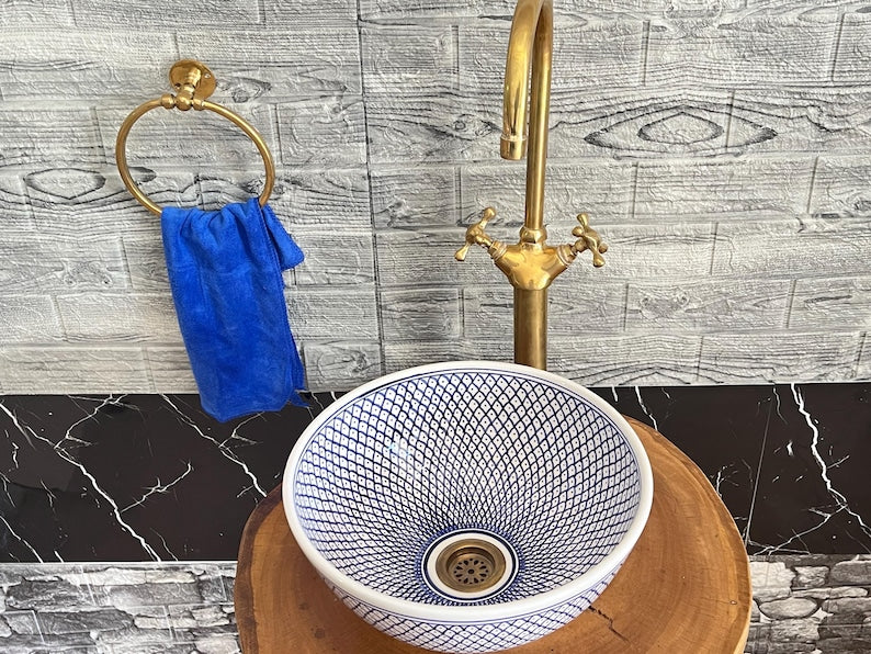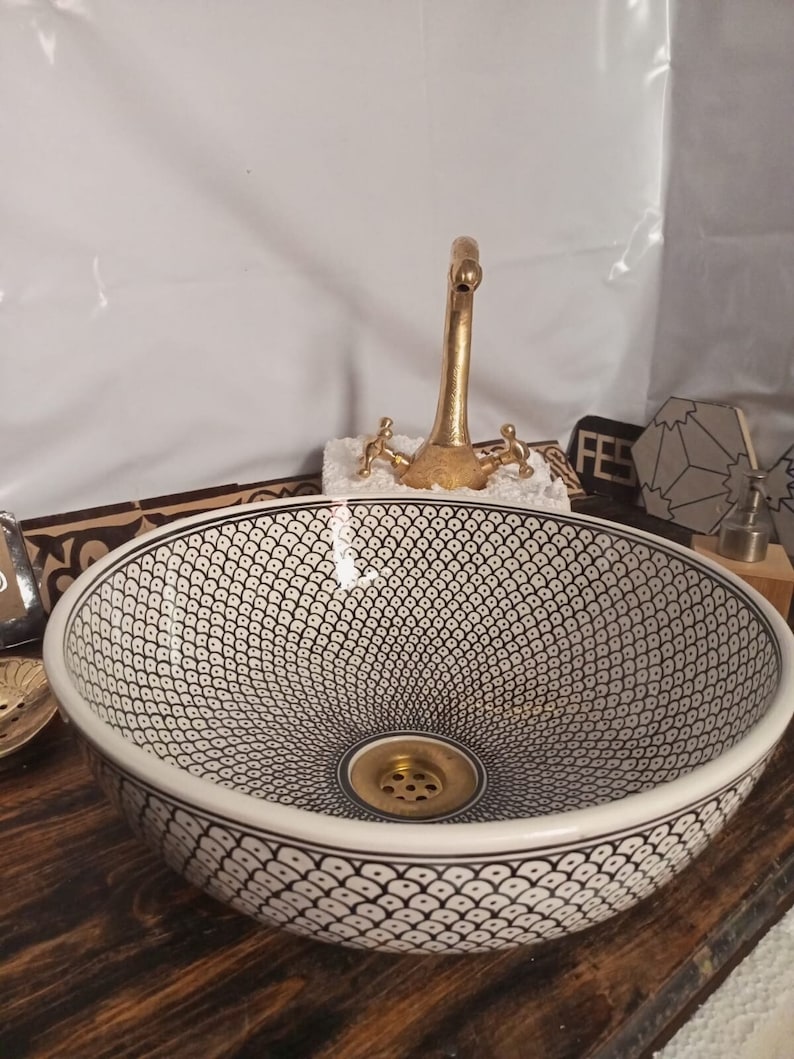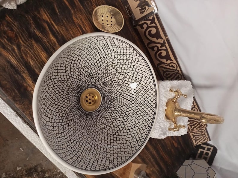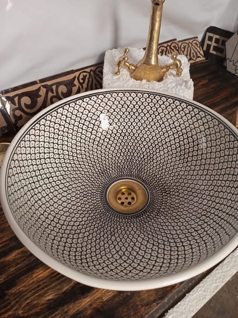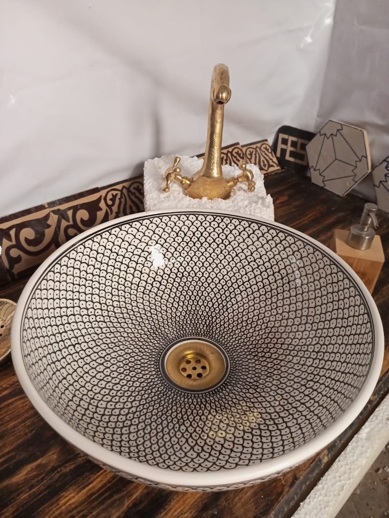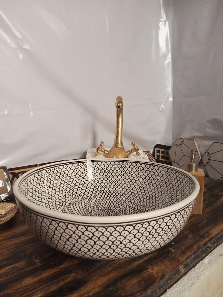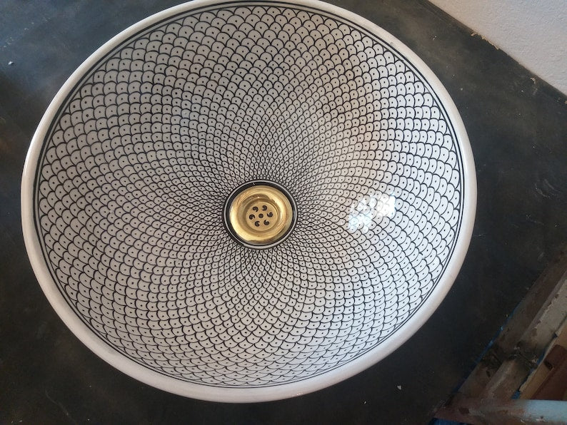 Elevate your bathroom decor with this stunning Hand Painted Ceramic Bathroom Sink Washbasin. Crafted with care and artistry, this luxury handcrafted counter top basin features a striking black and white design that adds a modern yet timeless touch to any space. Each artisan pottery basin is meticulously hand painted by skilled artisans, ensuring a unique piece that combines form and function seamlessly. The beautifully round shape and intricate geometric pattern create a captivating visual appeal, making it the perfect centerpiece for your bathroom. Durable and practical, this ceramic washbasin is designed to withstand daily use while offering a touch of elegance and sophistication. Whether you’re updating a farmhouse style or seeking a modern artisan statement piece, this custom luxury sink is a perfect choice. Easy to install and maintain, it’s the ideal blend of craftsmanship and contemporary design. Add a touch of artistry to your bathroom with this one-of-a-kind ceramic sink that’s as functional as it is beautiful.