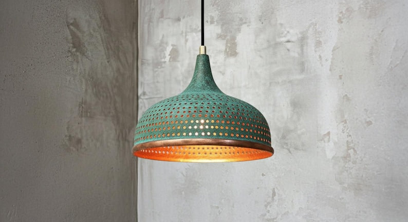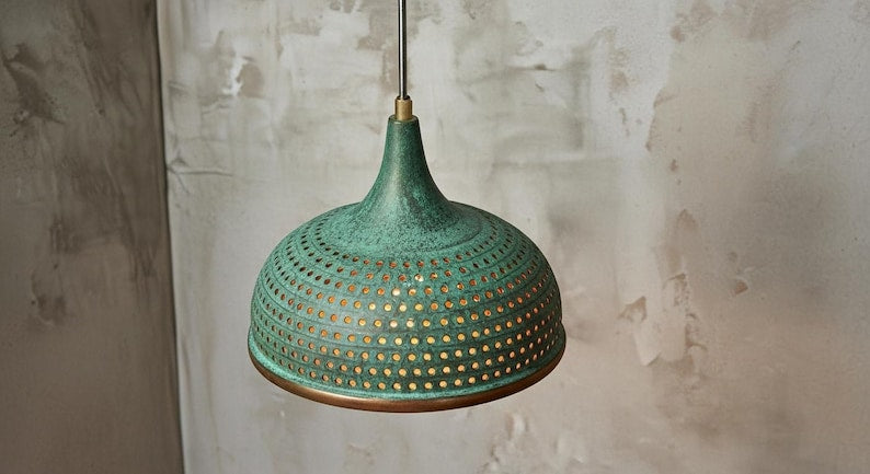 Bring warmth and character to your home with this handcrafted copper dome pendant light. Designed with a hammered finish and diamond-cut perforations, this lamp casts a soft, ambient glow while creating beautiful light patterns on your walls.