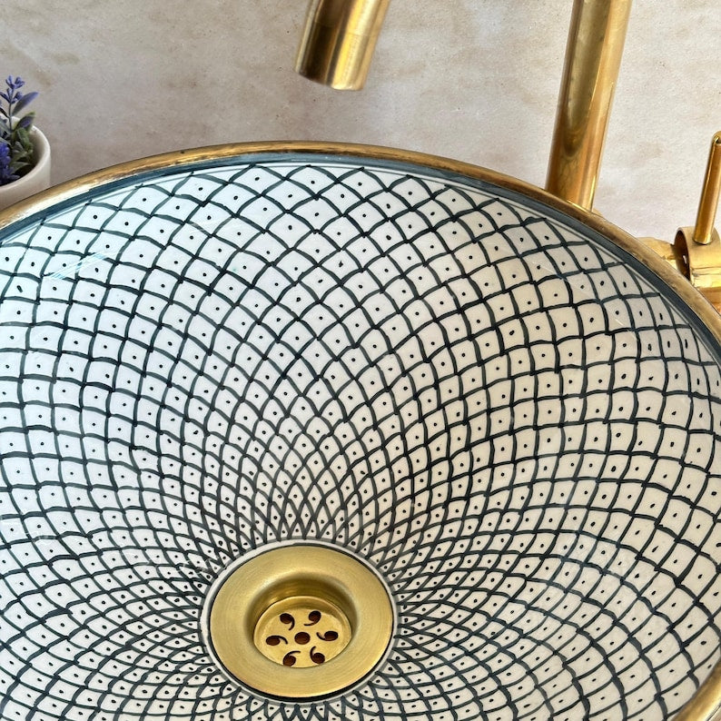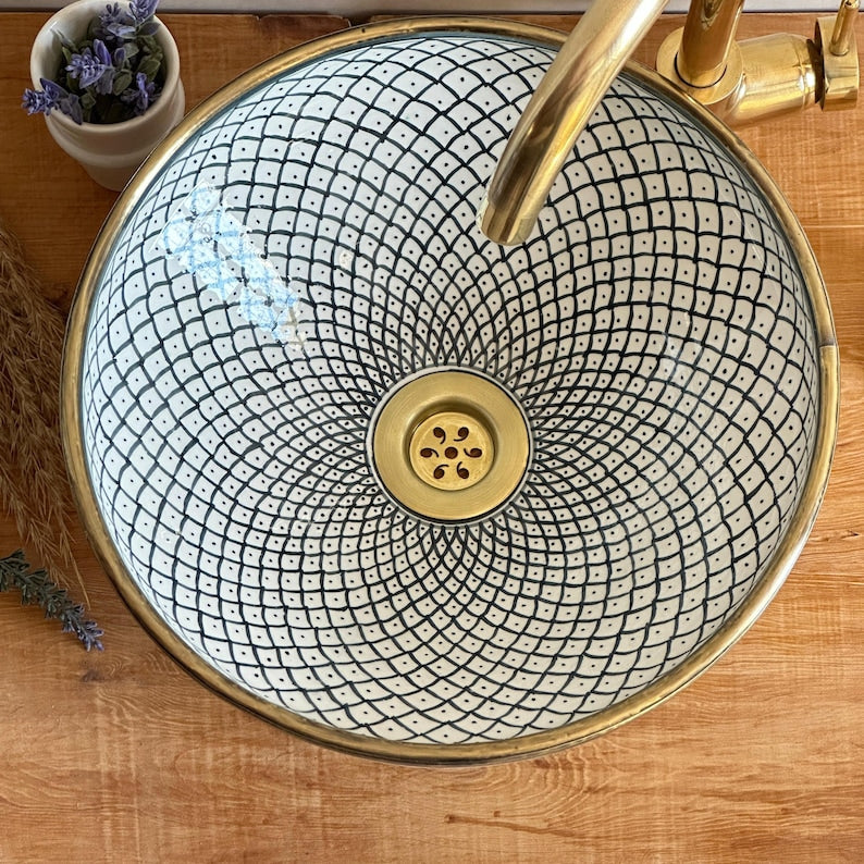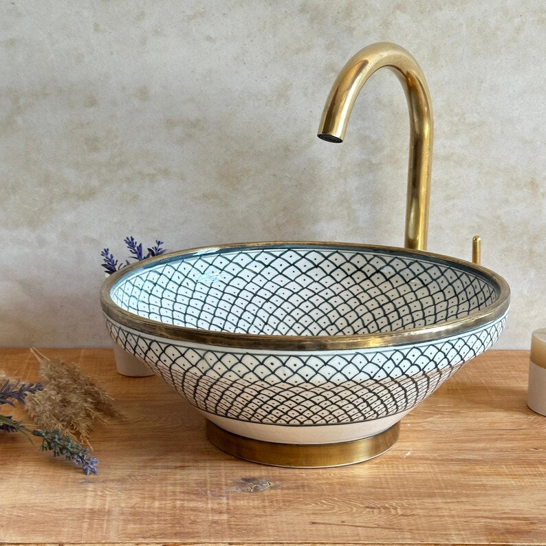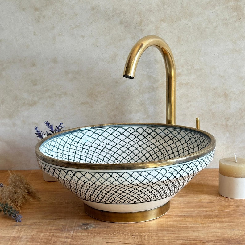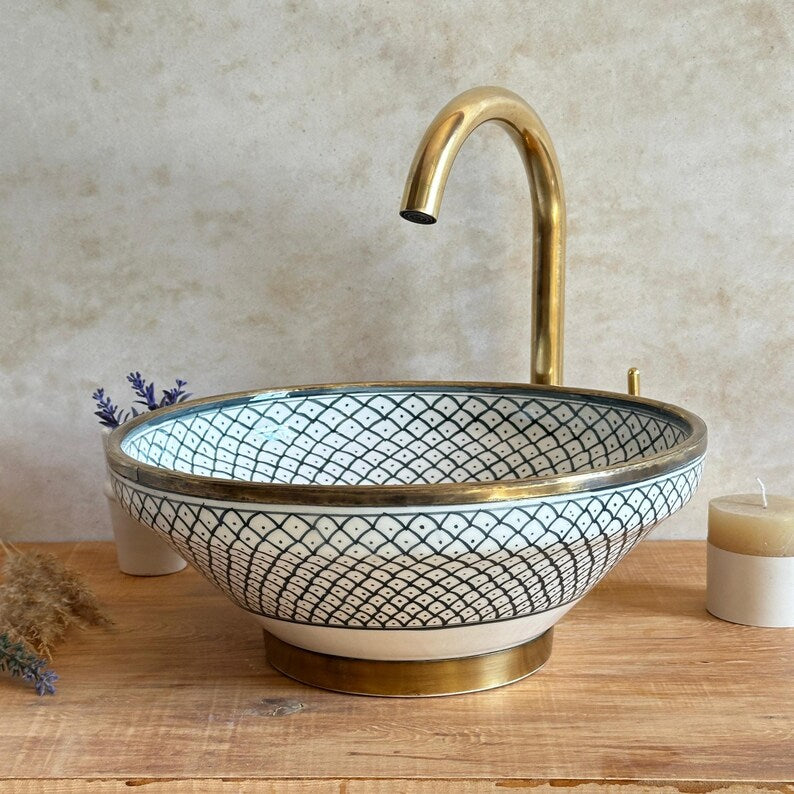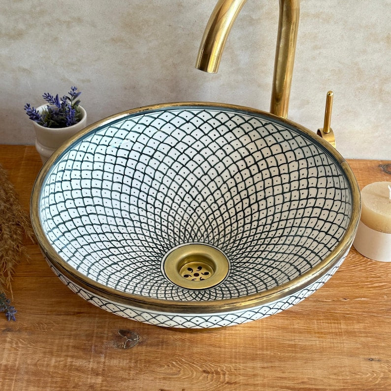 Bring the charm of the Mediterranean coast into your bathroom with this stunning handpainted ceramic vessel sink, featuring an elegant fish scale pattern. Carefully crafted by skilled artisans, this Mediterranean-style sink blends timeless design with functional beauty — a true centerpiece for any coastal or boho-chic bathroom.