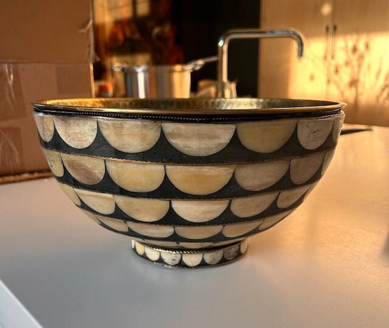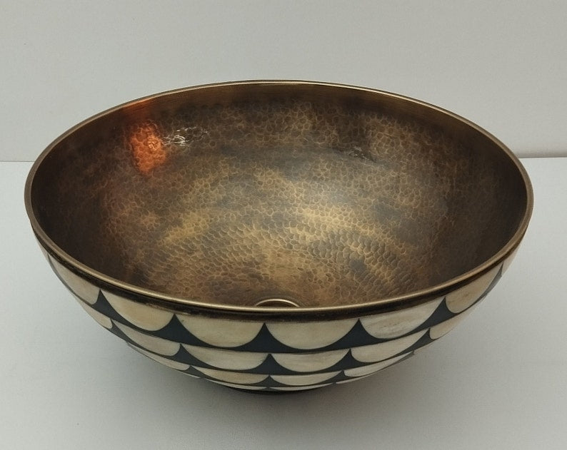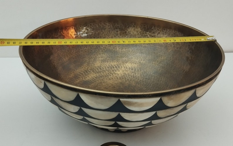 This basin is 100% handcrafted from solid, unpolished brass bronze, and acquires a warm color with age.