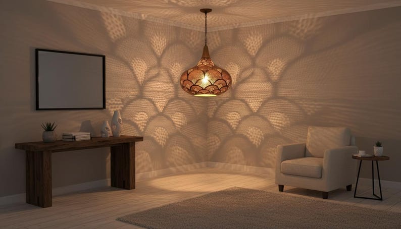 Simple Moroccan pendant lamp. A stunning Moroccan style hand-made ceiling light fixture- a pendant lamp is designed to enhance the exotic beauty of your home decor. Exclusive custom lighting designs from Arabian Home Décor will ensure that this Moroccan piece of art will complement your existing décor and completely enhance the ambiance by filling in the portion of darkness while leaving the remaining area soothing and serene