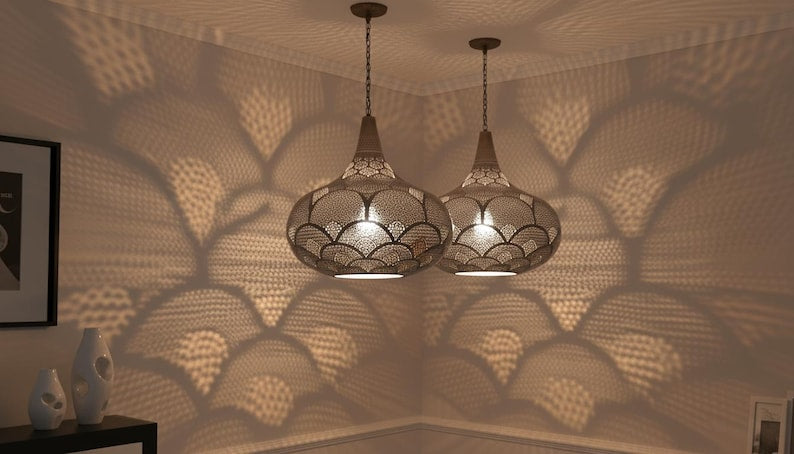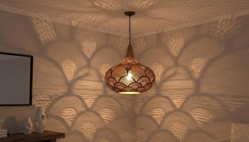 Handcrafted Moroccan Brass Pendant Light: Pierced Teardrop Boho Lamp