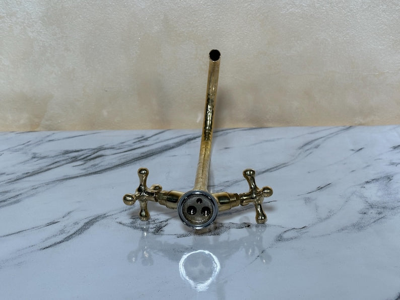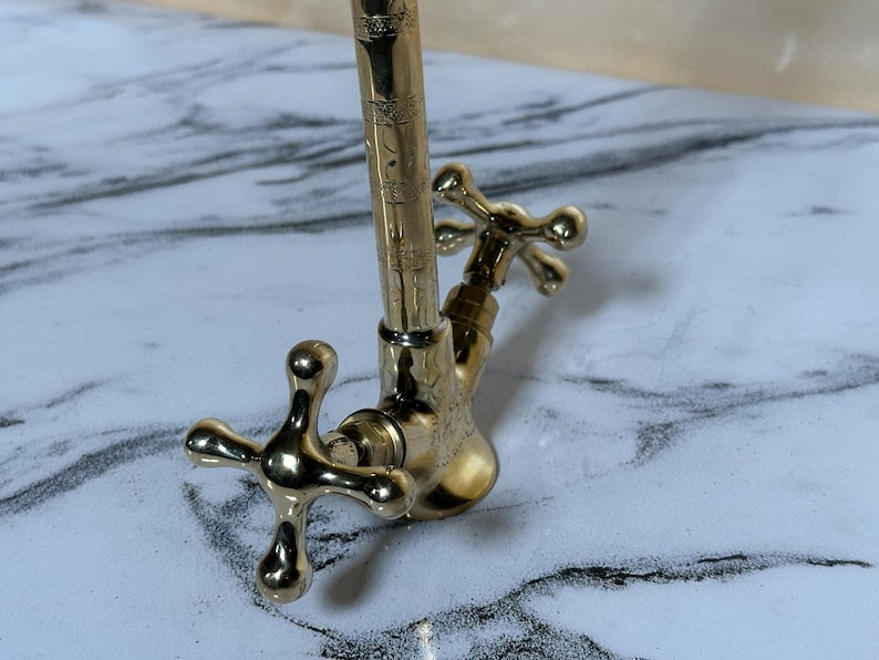 Handcrafted Moroccan Brass Wall Fountain with Solid Brass Dual-Handle Faucet – Antique Sink Basin for Bathroom, Kitchen, or Bath Décor