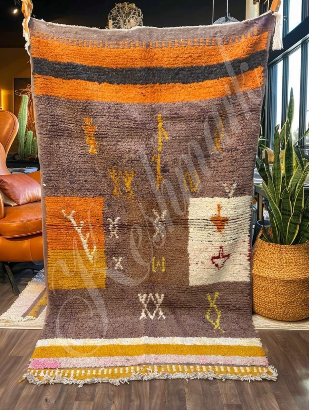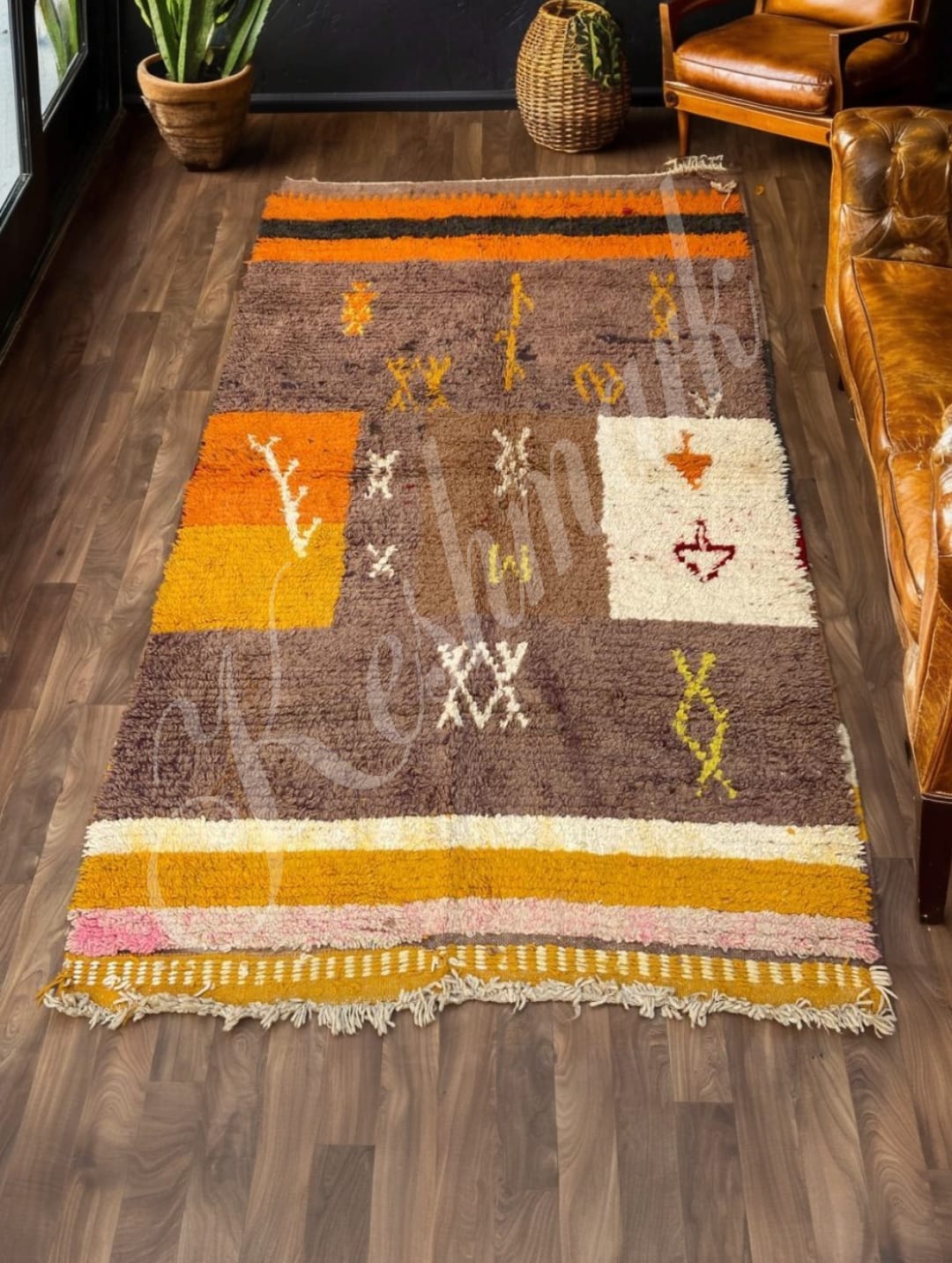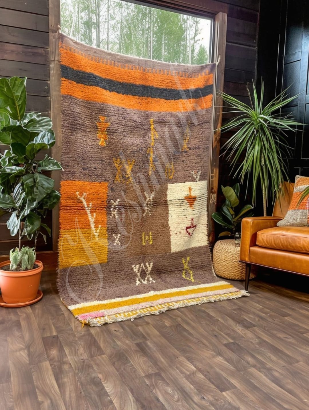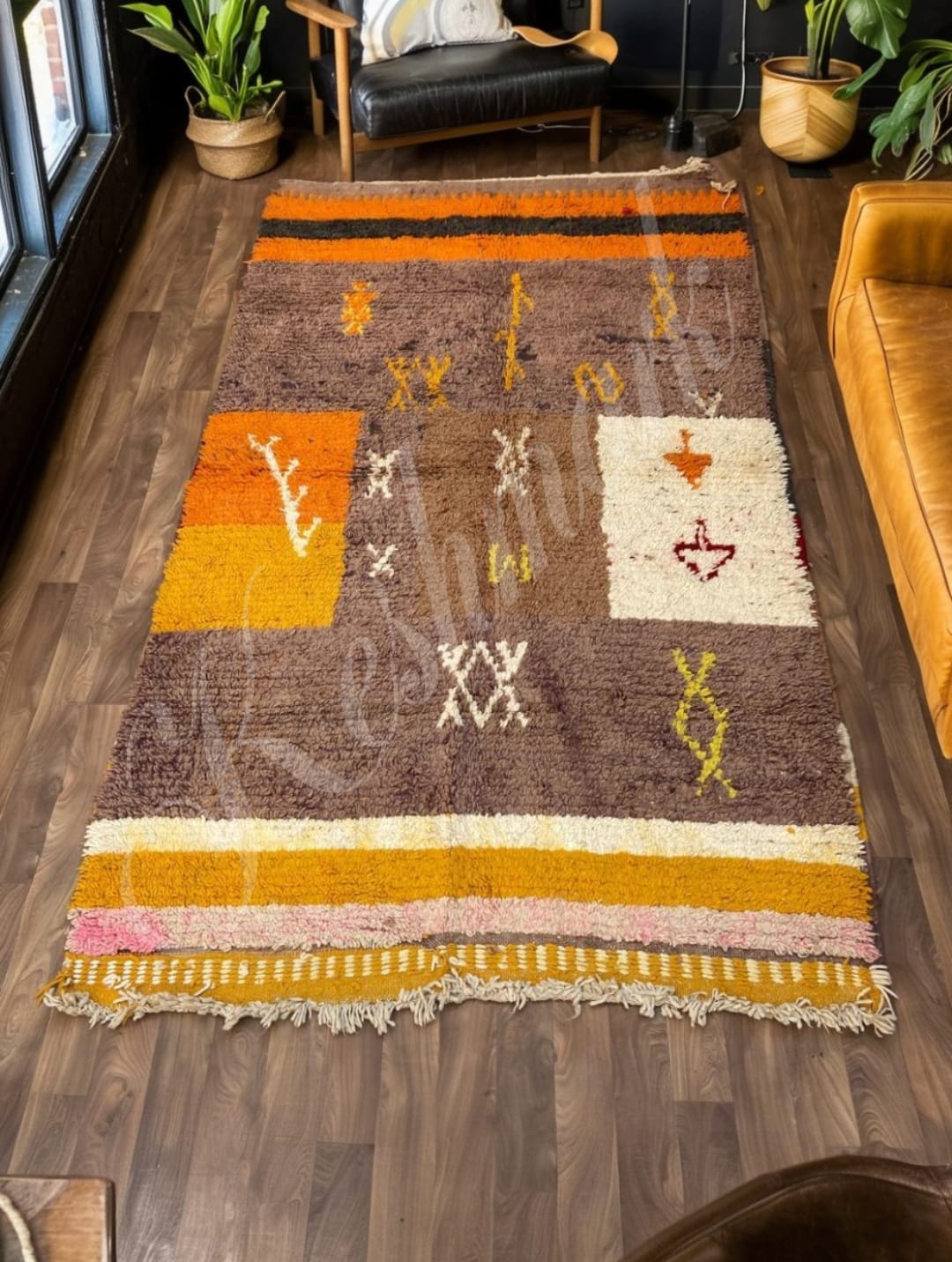Bring the warmth and authenticity of Moroccan craftsmanship into your home with this exquisite handmade wool Berber rug, skillfully woven by women artisans from the Atlas Mountains. Each rug is a unique creation, showcasing earthy tones—brown, burnt orange, mustard, black, and cream—beautifully combined with traditional Amazigh (Berber) symbols rich in history and meaning.