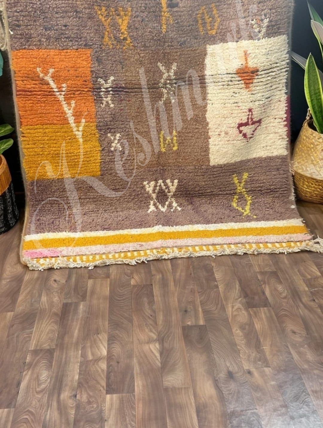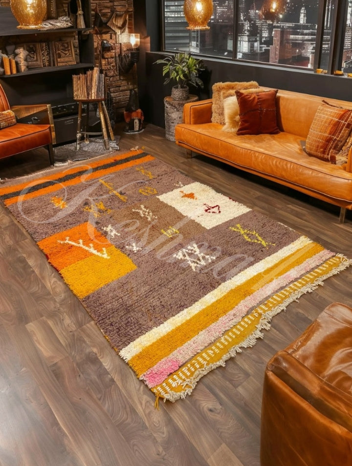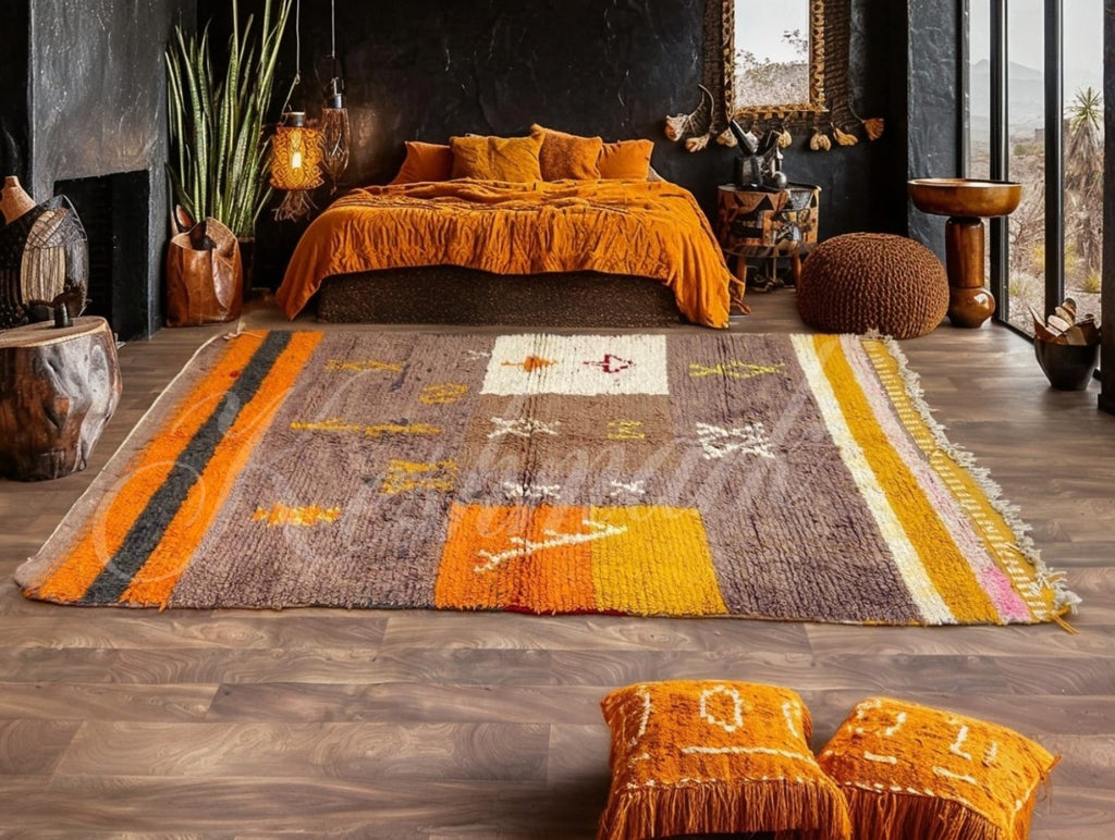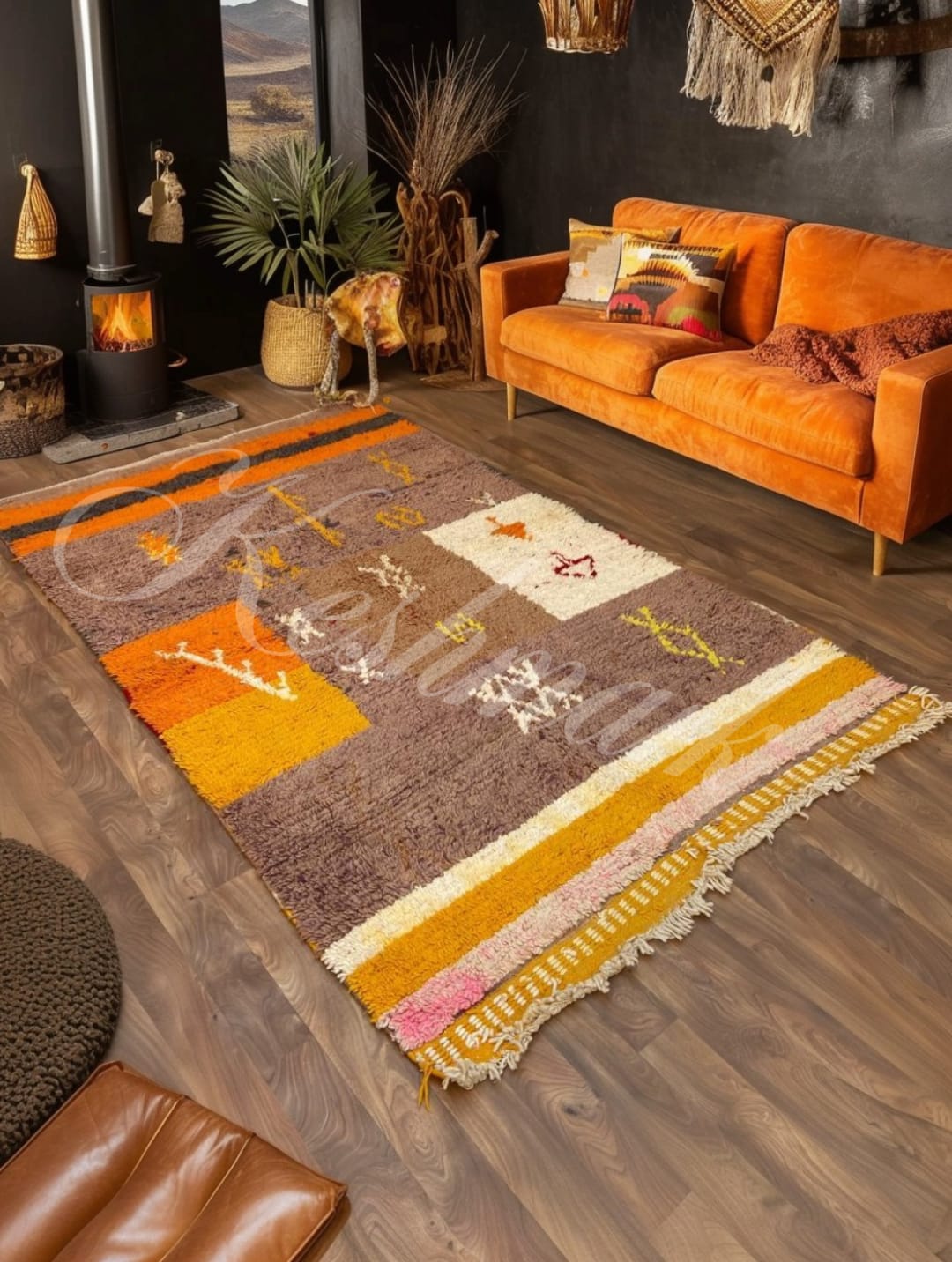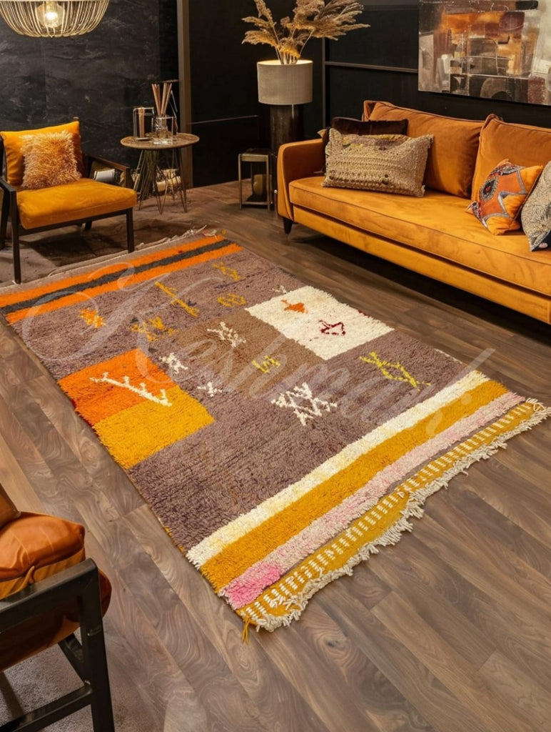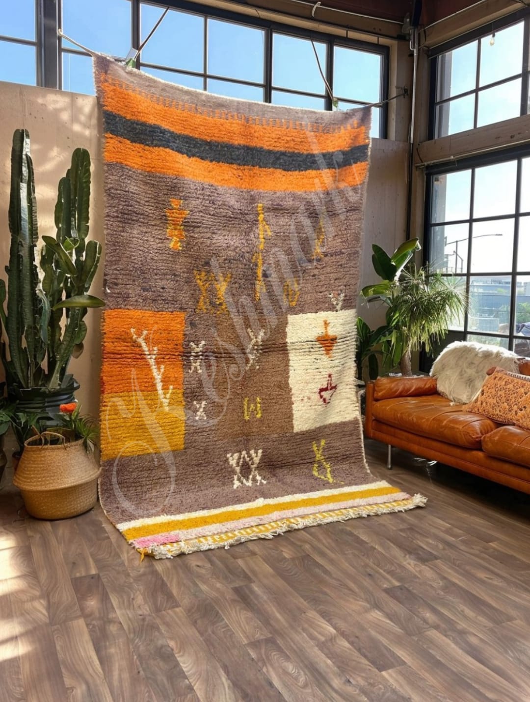 Bring the warmth and authenticity of Moroccan craftsmanship into your home with this exquisite handmade wool Berber rug, skillfully woven by women artisans from the Atlas Mountains. Each rug is a unique creation, showcasing earthy tones—brown, burnt orange, mustard, black, and cream—beautifully combined with traditional Amazigh (Berber) symbols rich in history and meaning.