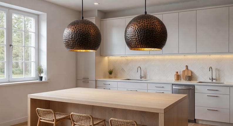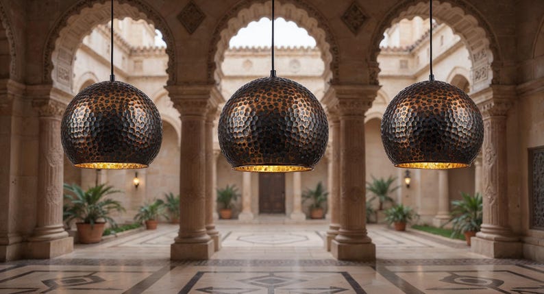 Bring warmth and character to your space with this handcrafted dome pendant light, featuring a rich patina copper finish. Perfect for kitchens, dining areas, or living spaces, this rustic industrial lamp blends vintage charm with modern design. Each lamp is meticulously crafted, making every piece unique with natural variations in tone and texture. Ideal for adding a statement piece to your décor or enhancing your Moroccan-inspired interiors.